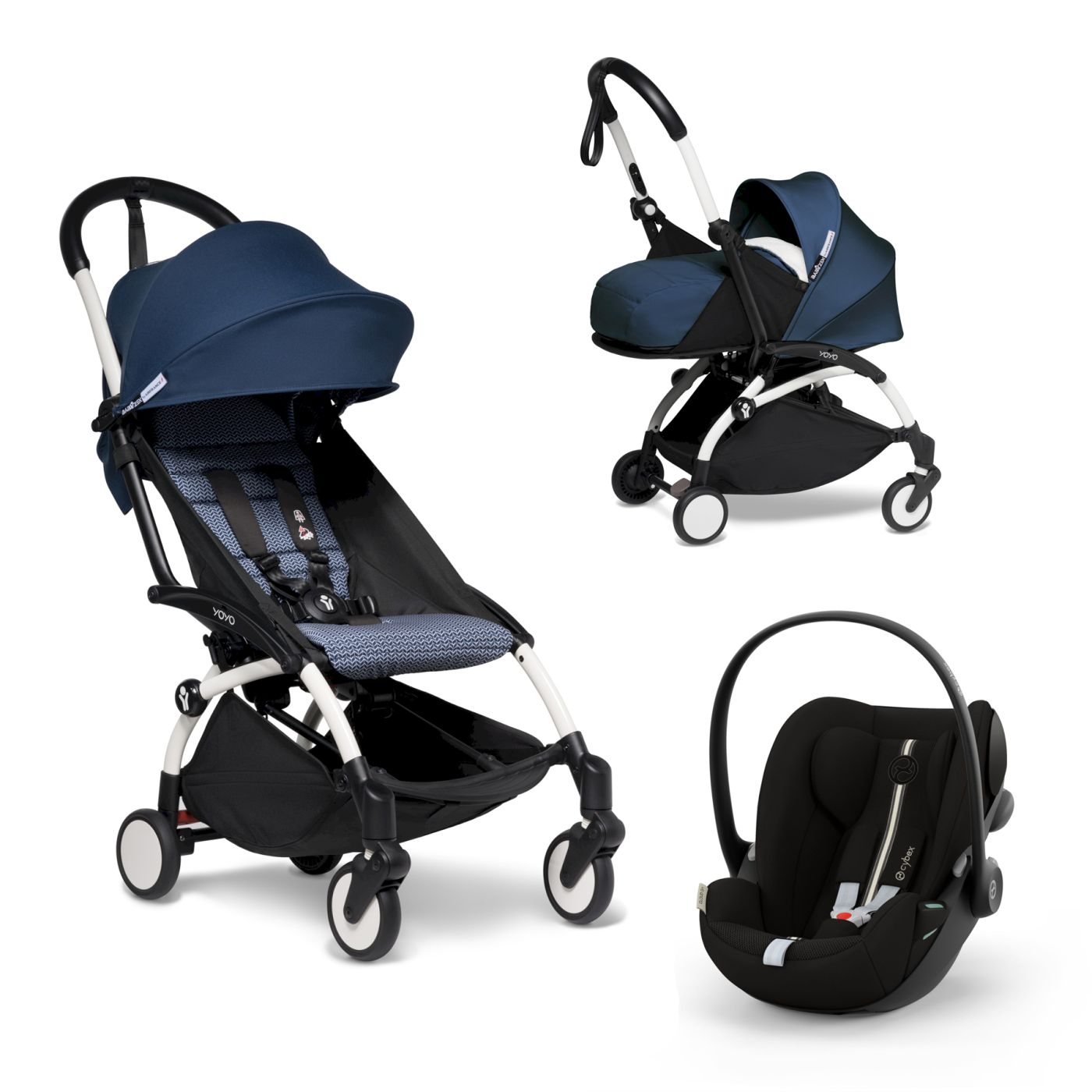 Бебешка количка BABYZEN YOYO² 3 в 1, бяла рамка, пакет за новородено, столче за кола Cloud G и цветен пакет Air France