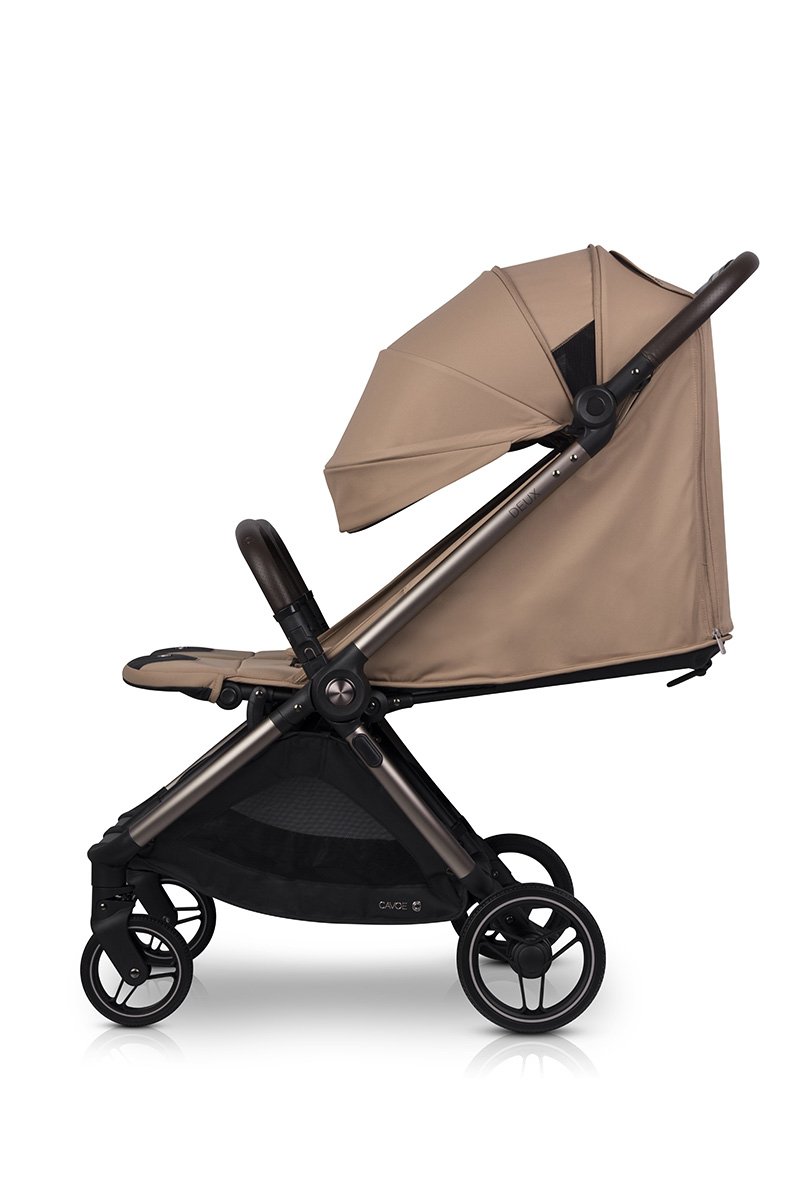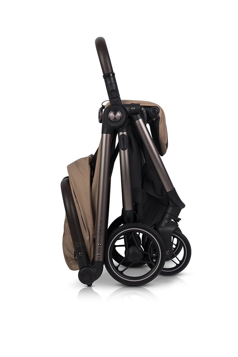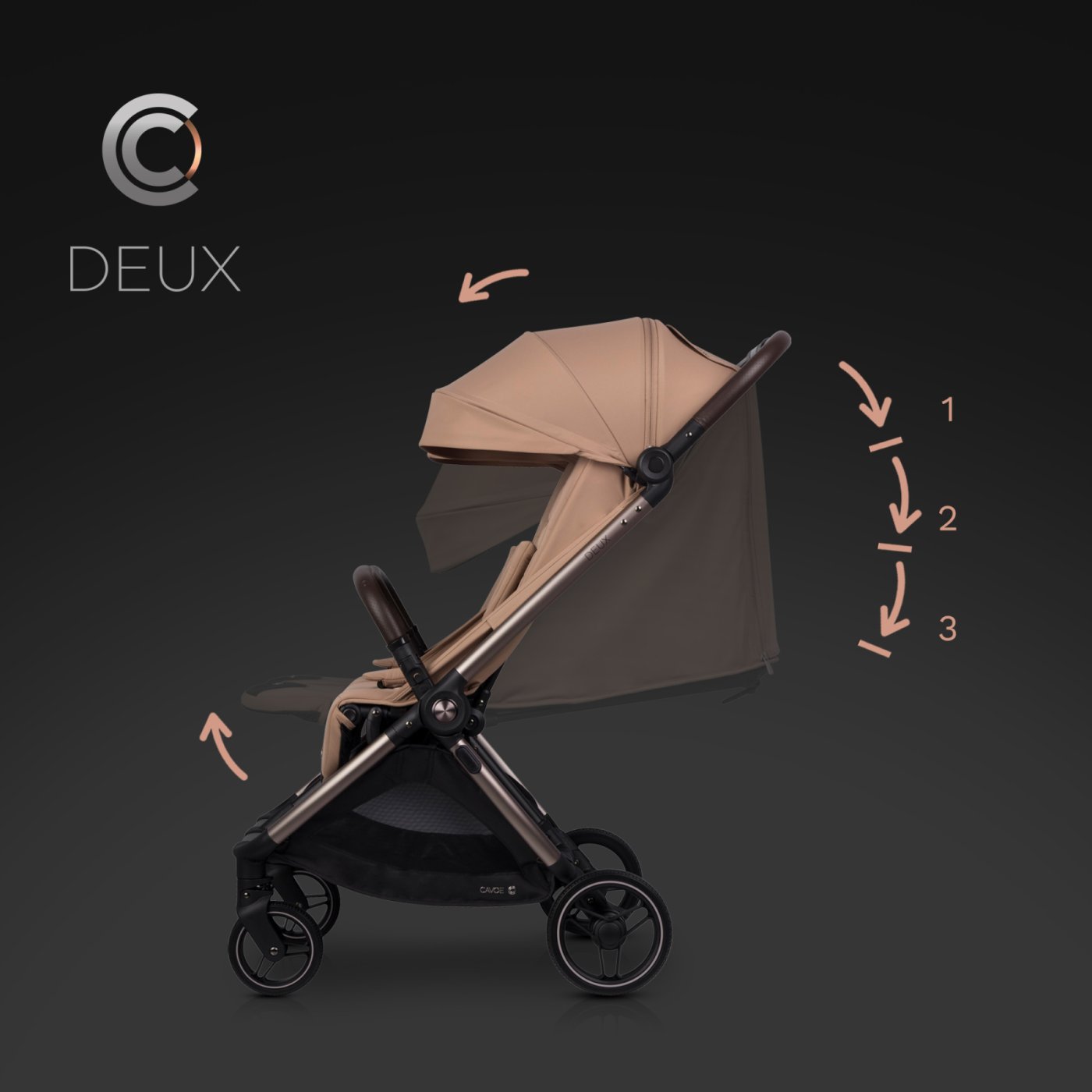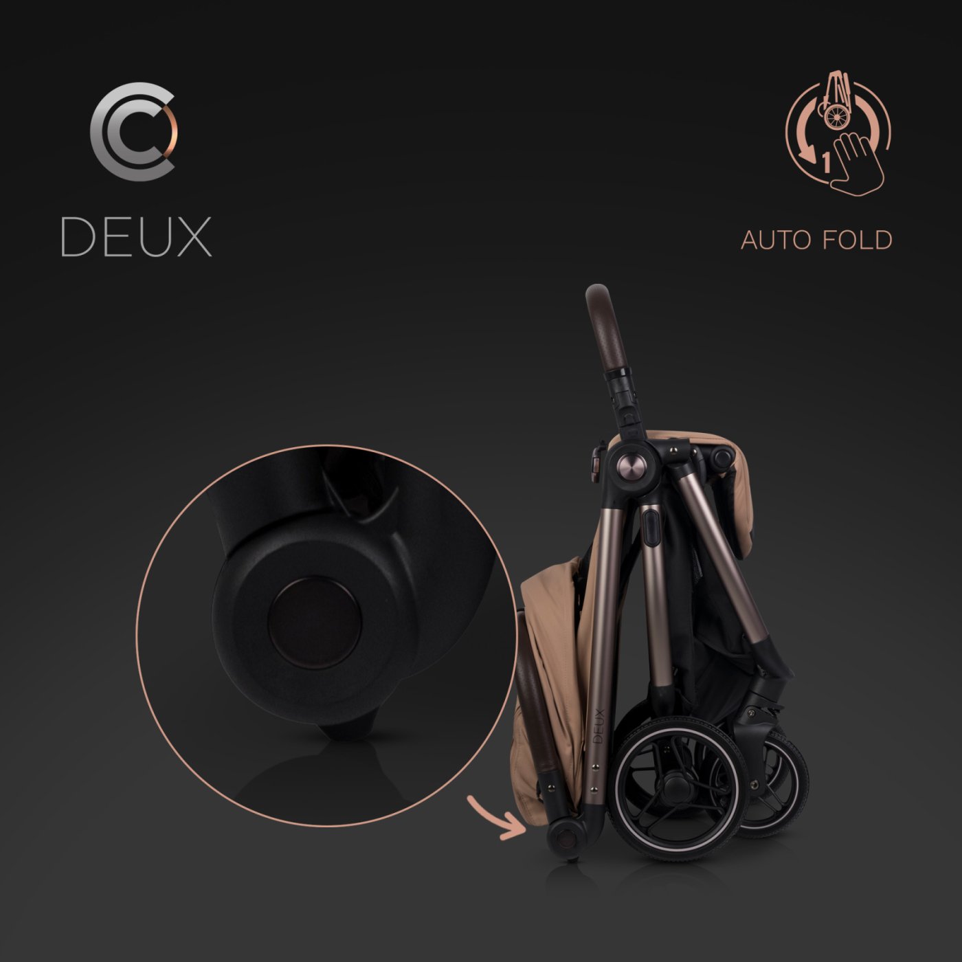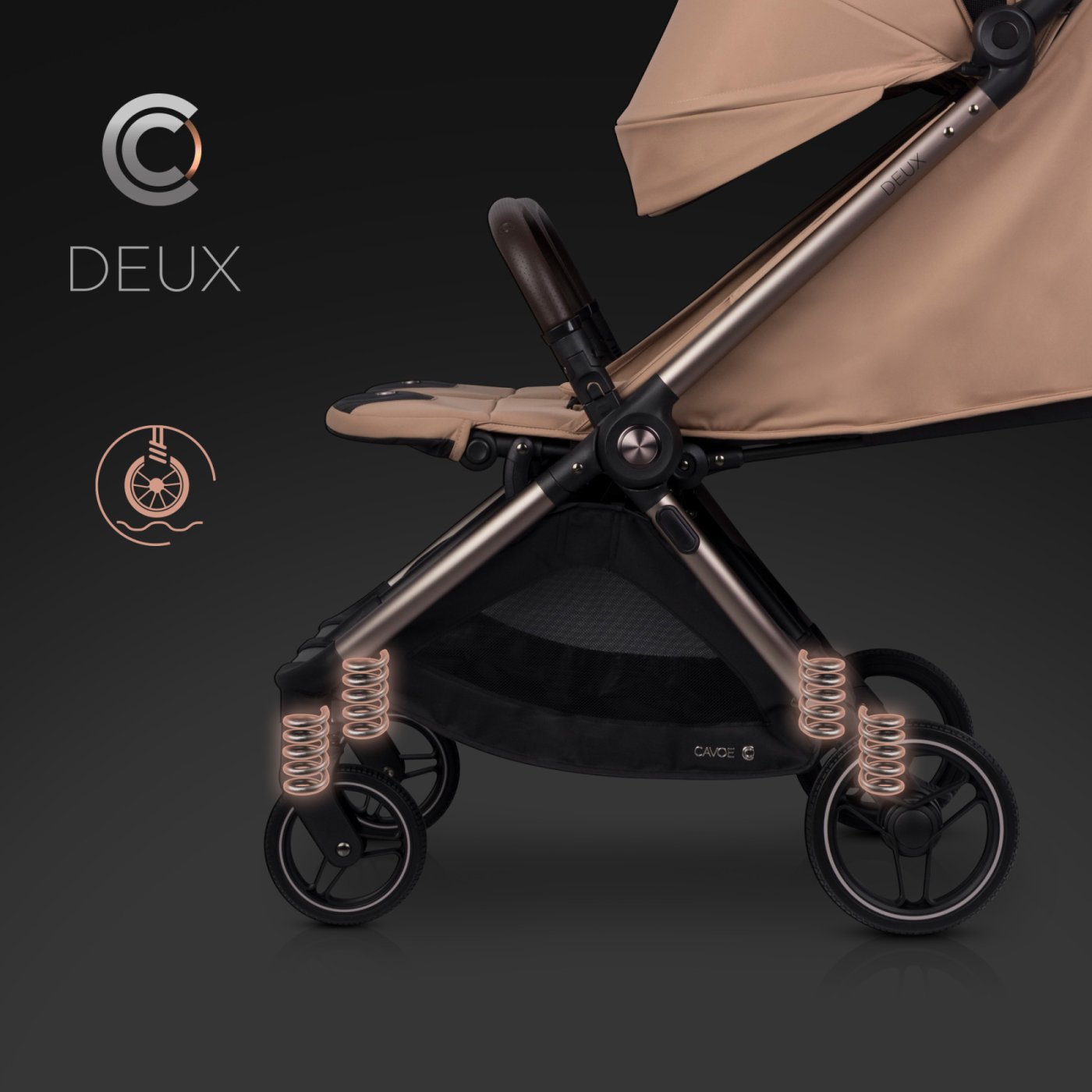 Автоматична система за сгъване DUAL FOLD Основната иновация на модела Cavoe Deux е системата за автоматично сгъване. С една ръка количката се сгъва компактно, като остава изправена след сгъване. Тази функция е от съществено значение за активните родители, улесняваща транспортирането в багажника или съхранението в тесни пространства.