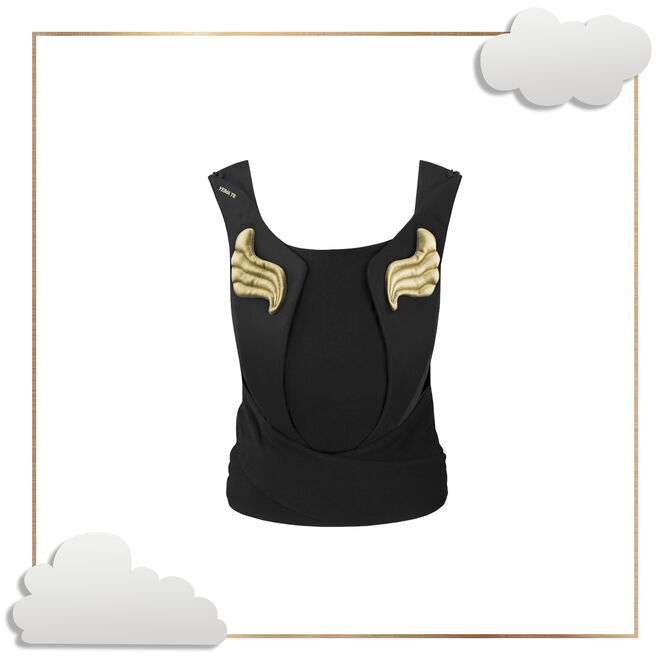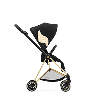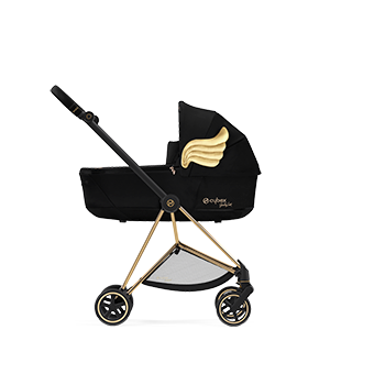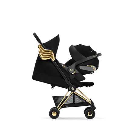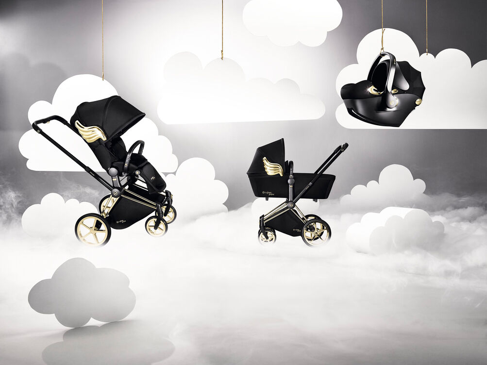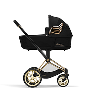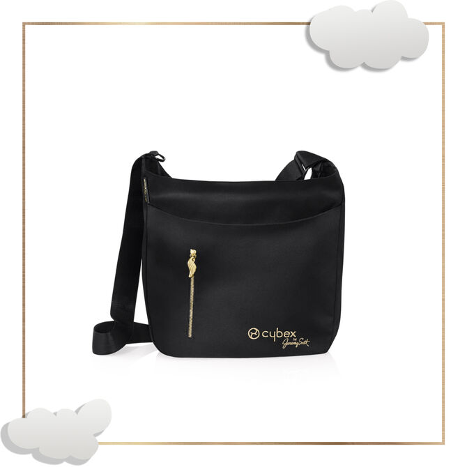 Черна и украсена със златни детайли, полезната чанта CYBEX Priam от Jeremy Scott се предлага с мокро отделение, поставка за бутилка, подложка за повиване и допълнителен външен джоб с очарователен златен цип във формата на крило.