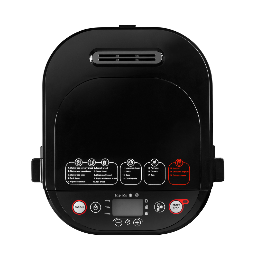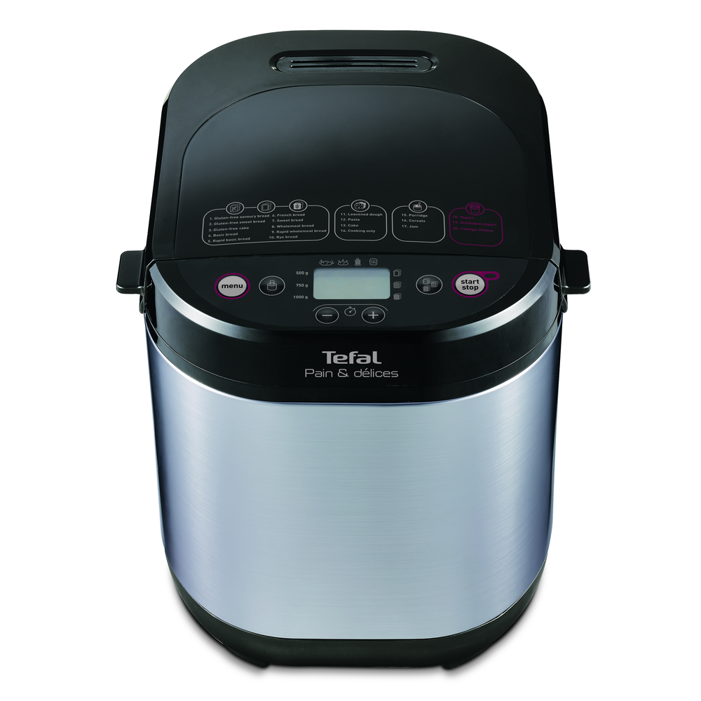 Хлябомашината Tefal Pain & Delice PF240E38 ви помага да приготвяте пресен хляб у дома, както и други вкусни ястия, от пица и паста до сладко, каша или млечни продукти като кисело мляко или извара, благодарение на специалния контейнер за млечни продукти . Уредът се предлага с 20 автоматични програми , включително програми без глутен , 3 нива на изпичане на коричката и 3 настройки за тегло за хляб от 500–1000 г, така че всеки път получавате желания хляб.