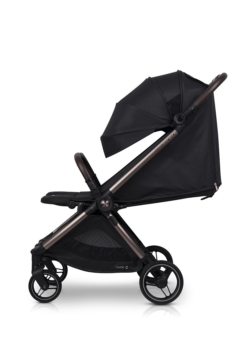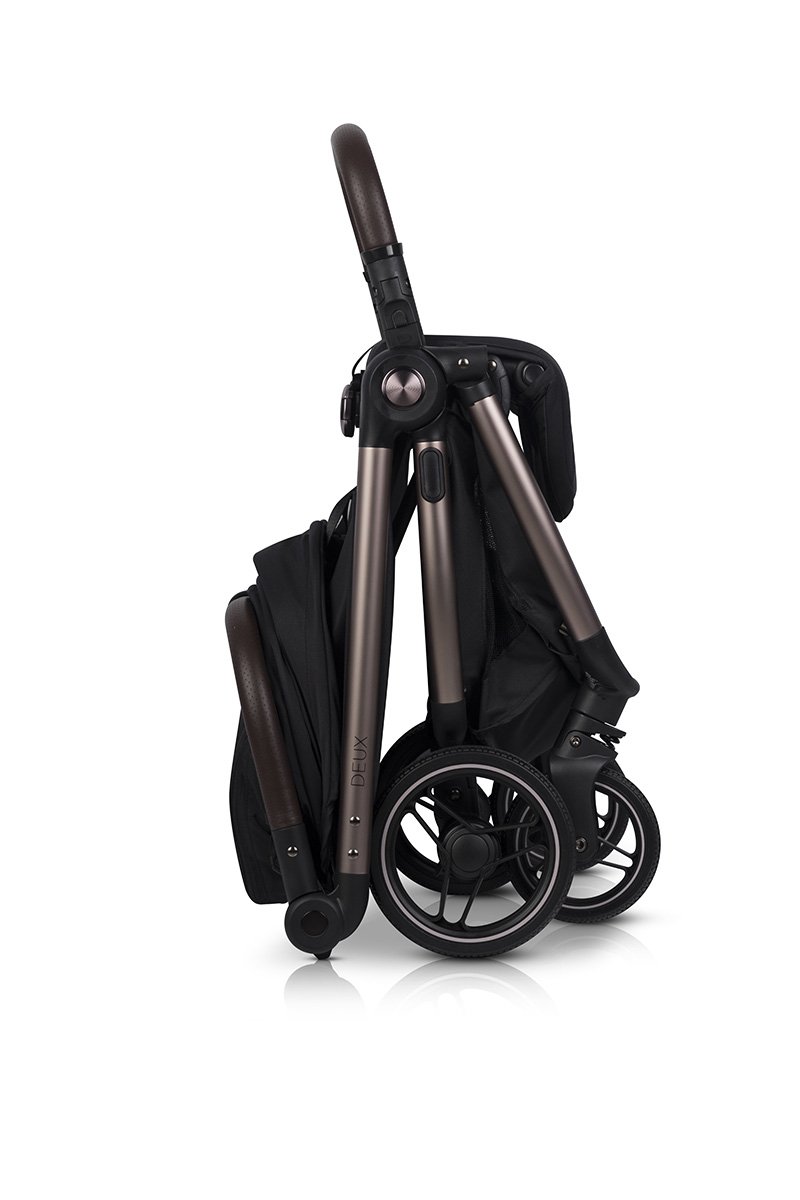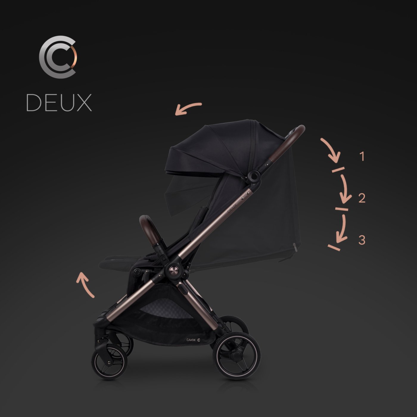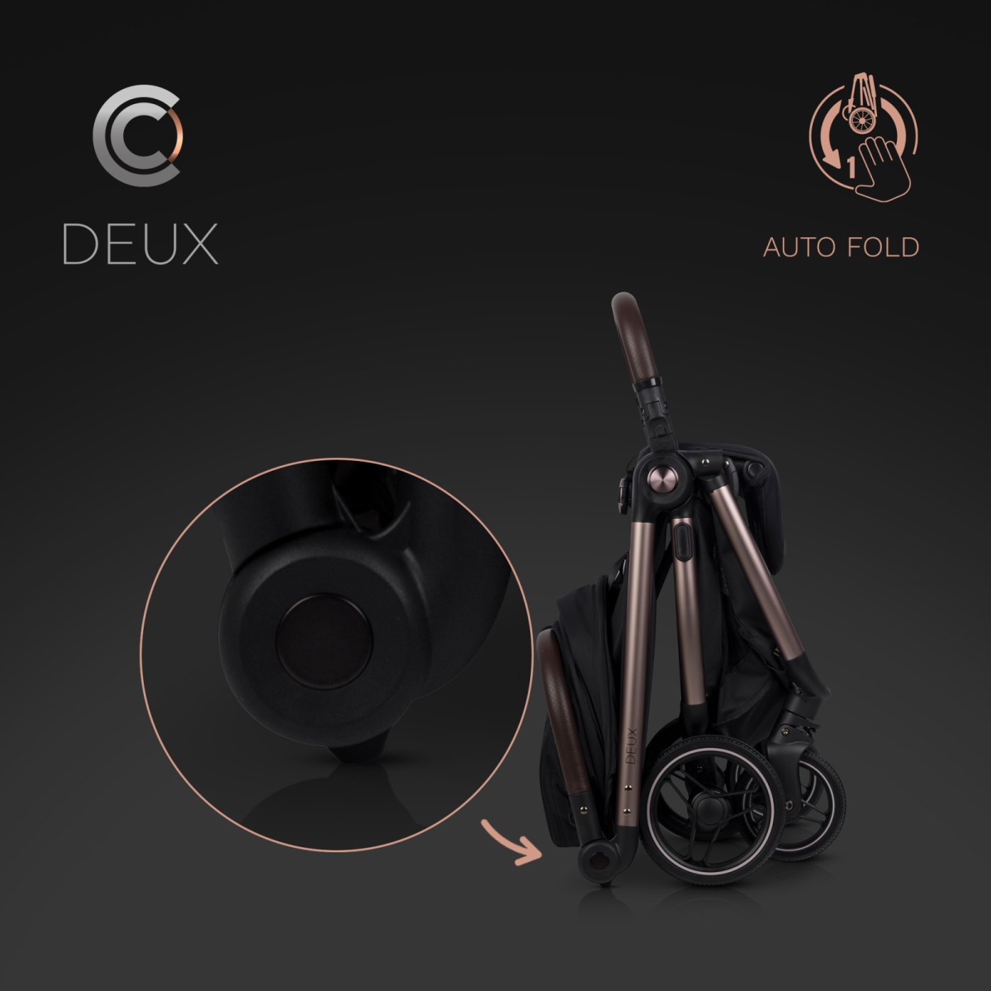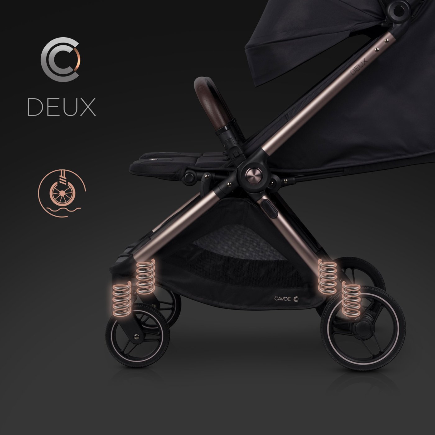Автоматична система за сгъване DUAL FOLD Основната иновация на модела Cavoe Deux е системата за автоматично сгъване. С една ръка количката се сгъва компактно, като остава изправена след сгъване. Тази функция е от съществено значение за активните родители, улесняваща транспортирането в багажника или съхранението в тесни пространства.