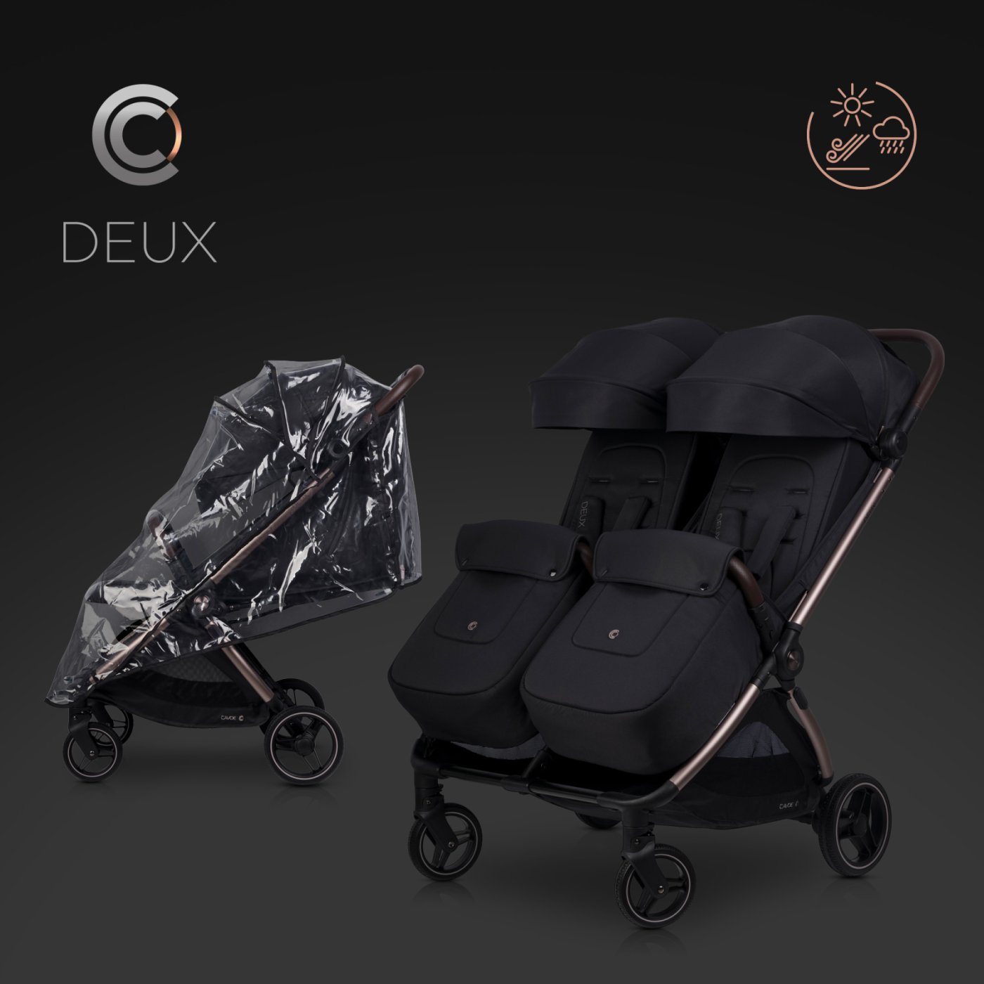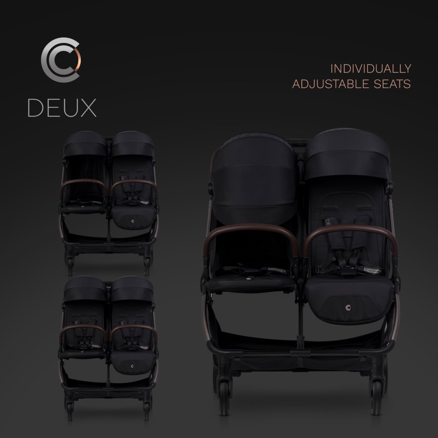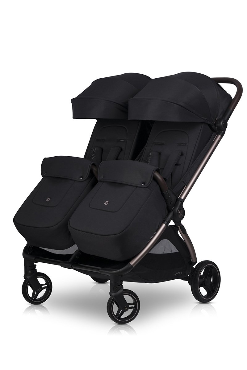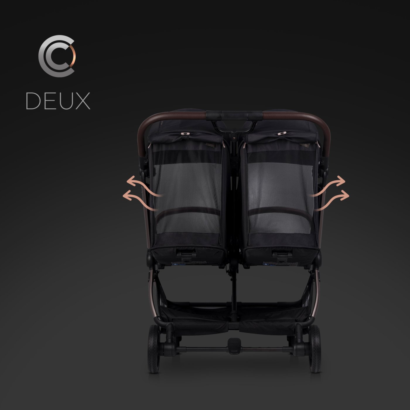 Открийте количката Cavoe Deux Chocolate за близнаци и братя и сестри. Тя предлага компактен дизайн, автоматична система за сгъване DUAL FOLD, гел колела с окачване и удобни седалки, издържащи до 22 кг всяка. Изберете комфорт, безопасност и елегантност при всяка разходка!