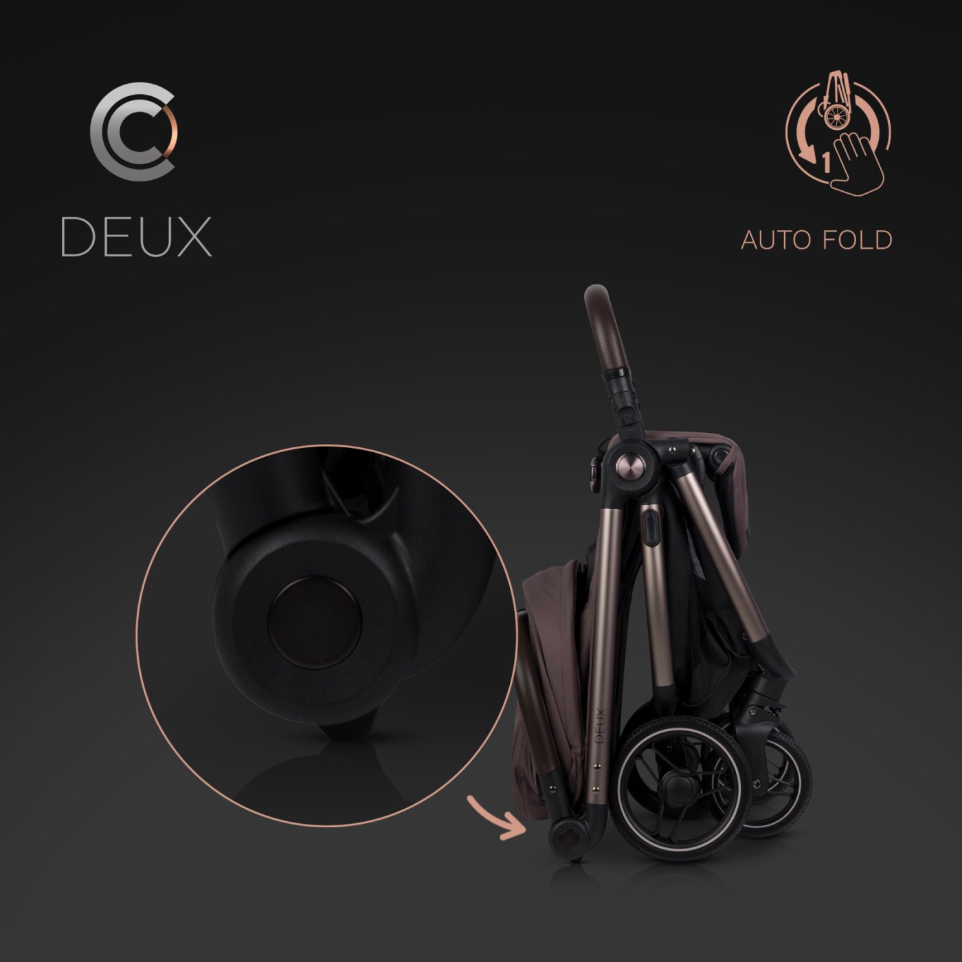 Автоматична система за сгъване DUAL FOLD Основната иновация на модела Cavoe Deux е системата за автоматично сгъване. С една ръка количката се сгъва компактно, като остава изправена след сгъване. Тази функция е от съществено значение за активните родители, улесняваща транспортирането в багажника или съхранението в тесни пространства.