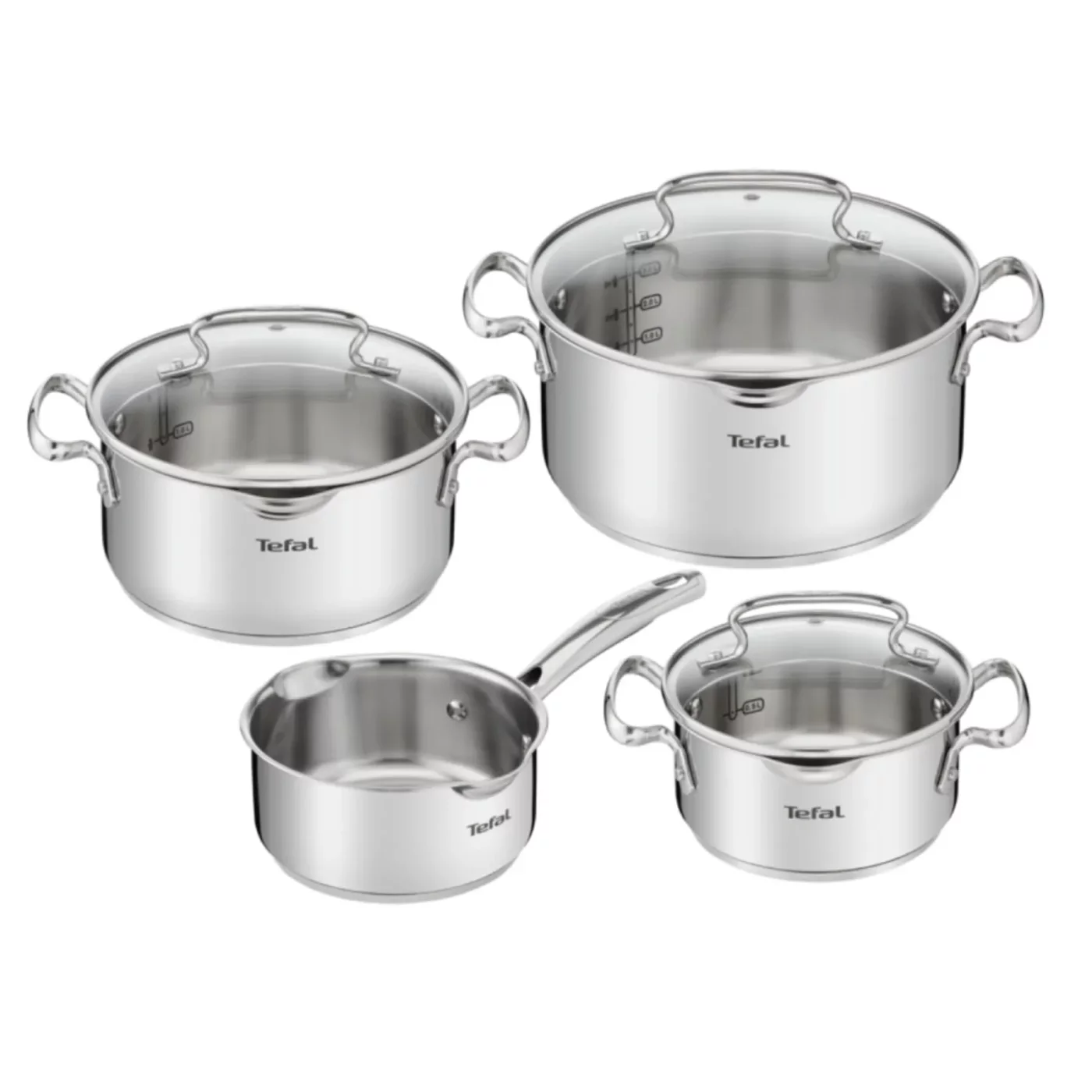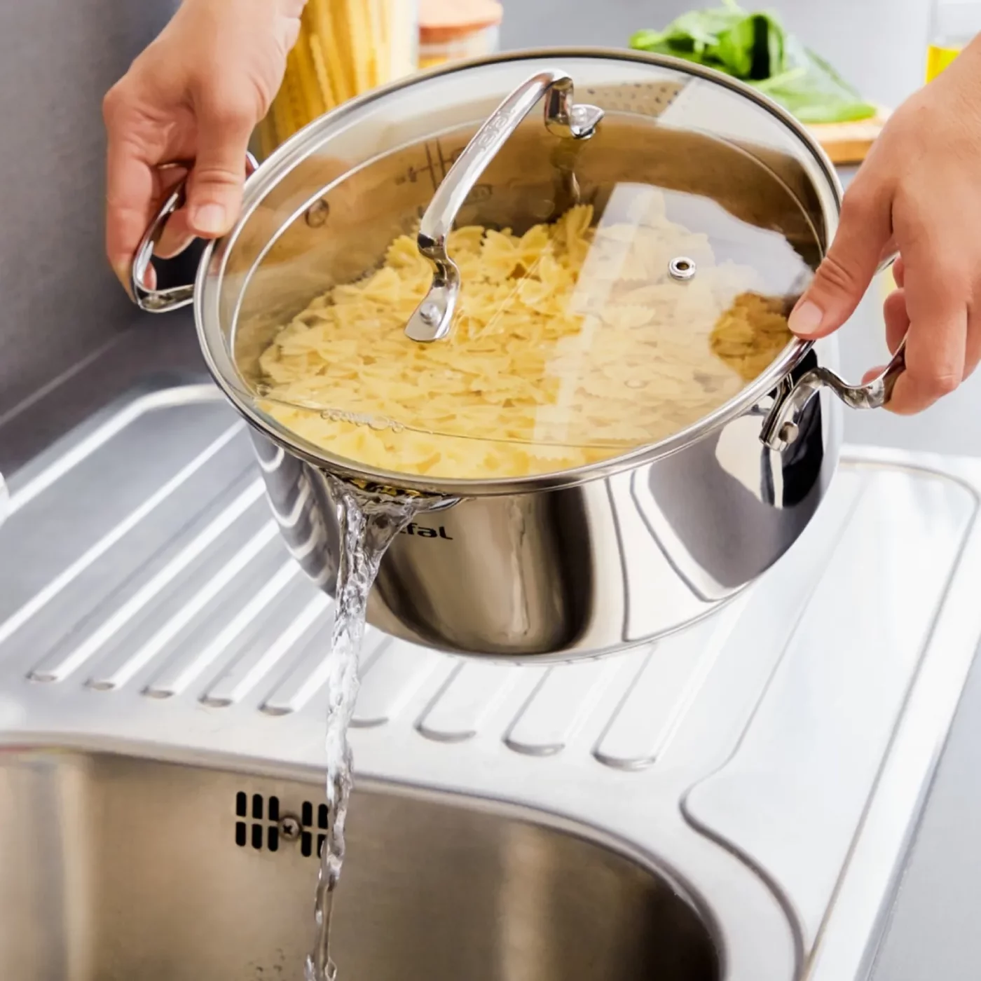 Насладете се на безгрижни кулинарни сесии с комплекта от 7 части Tefal Duetto+ G719S735 от първокласна неръждаема стомана. Комплектът включва 3 тенджери (16 см, 20 см, 24 см), оборудвани с интелигентни стъклени капаци с отвори за оттичане, и тенджера с диаметър 16 см. Тенджерите са снабдени със специални ръбове за лесно наливане, вътрешни градуировки за прецизно дозиране и нитовани дръжки за безопасност. Перфектна съвместимост с всички източници на топлина, включително индукционни котлони.