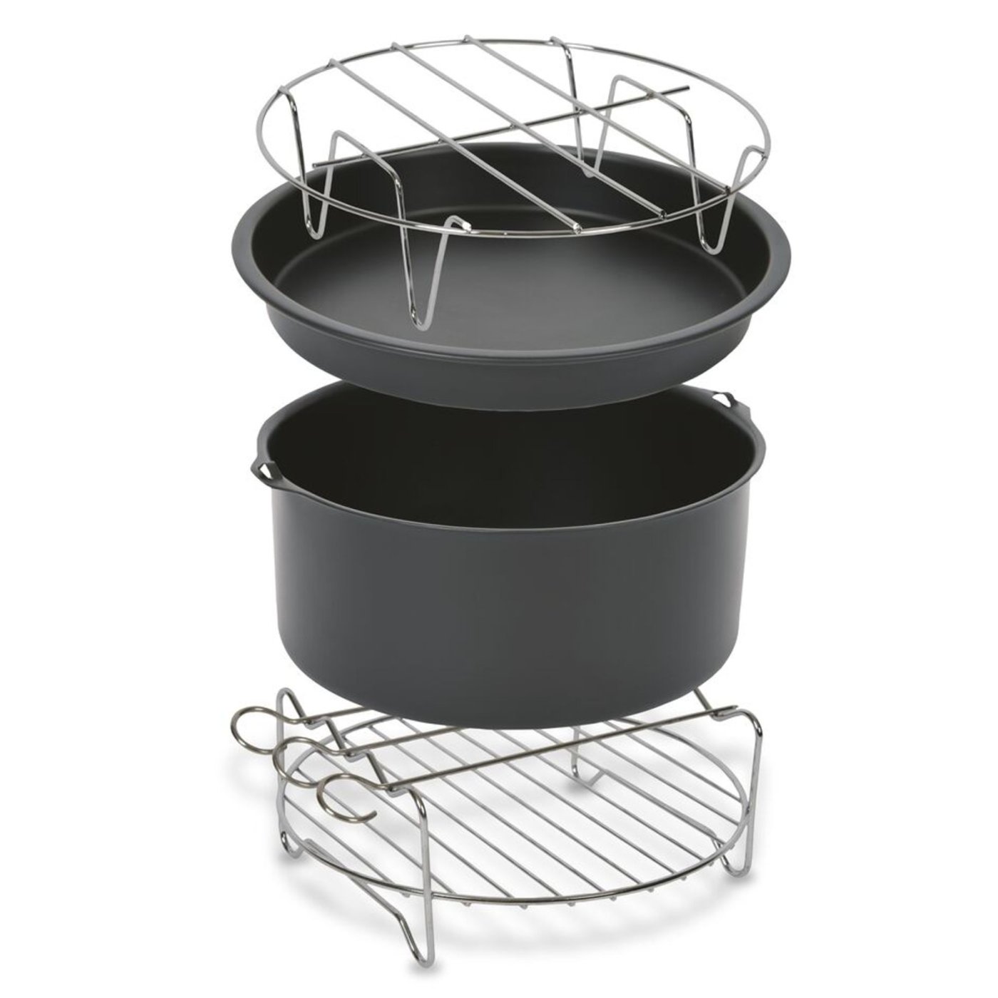 Комплектът включва форма за торта, тава за пица, поставка за шишчета и метална решетка, всички с диаметър 18 см, идеални за едновременно готвене или разнообразяване на ястия. Аксесоарите са съвместими с няколко модела фритюрници Tefal Easy Fry, включително EY245, EY801, FW5018, EY701 и FW20.