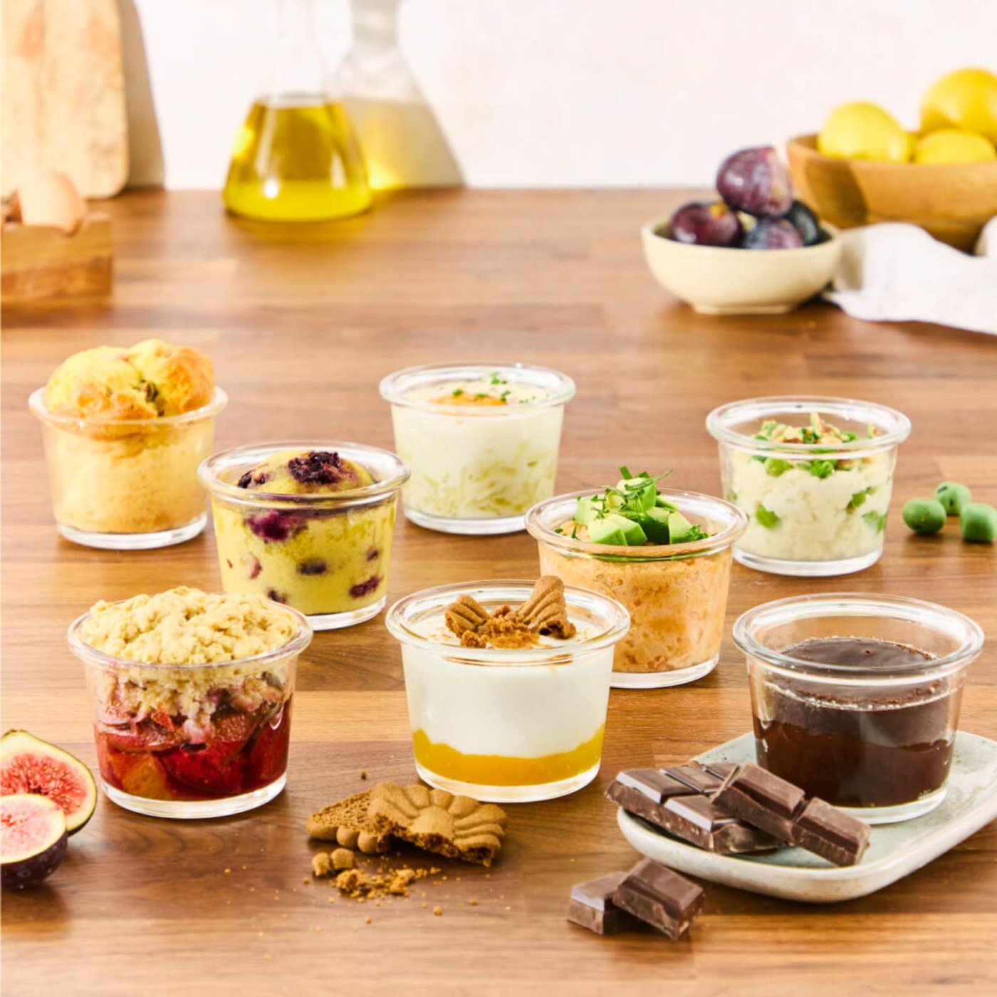 Част от семейството аксесоари Easy Fry, стъклените контейнери са идеални за десерти като мусове и домашно приготвени кисели млека, но също така и за креативни предястия – терини, топли дипове или индивидуални закуски. Благодарение на двустепенната поддръжка за готвене, можете да приготвите до 8 кисели млека или 4 различни ястия едновременно, спестявайки време и енергия.