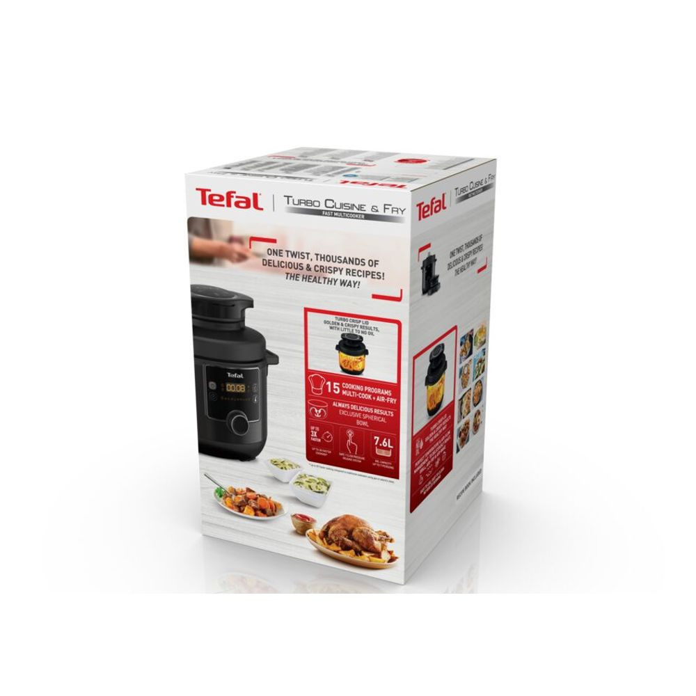 Открийте мултикукъра Tefal Turbo Cuisine & Fry, идеалният партньор за бързо, здравословно и лесно готвене. Той комбинира функцията за готвене под налягане с капака с горещ въздух, за да получите крехки, сочни и хрупкави ястия, от пържоли и гратинирани зеленчуци до пържени картофи и вкусни десерти. Ексклузивната технология Tefal Spherical Bowl предлага голяма повърхност за готвене и оптимално разсейване на топлината, така че вашите рецепти се приготвят перфектно, до 3 пъти по-бързо* в сравнение с класическа тенджера.