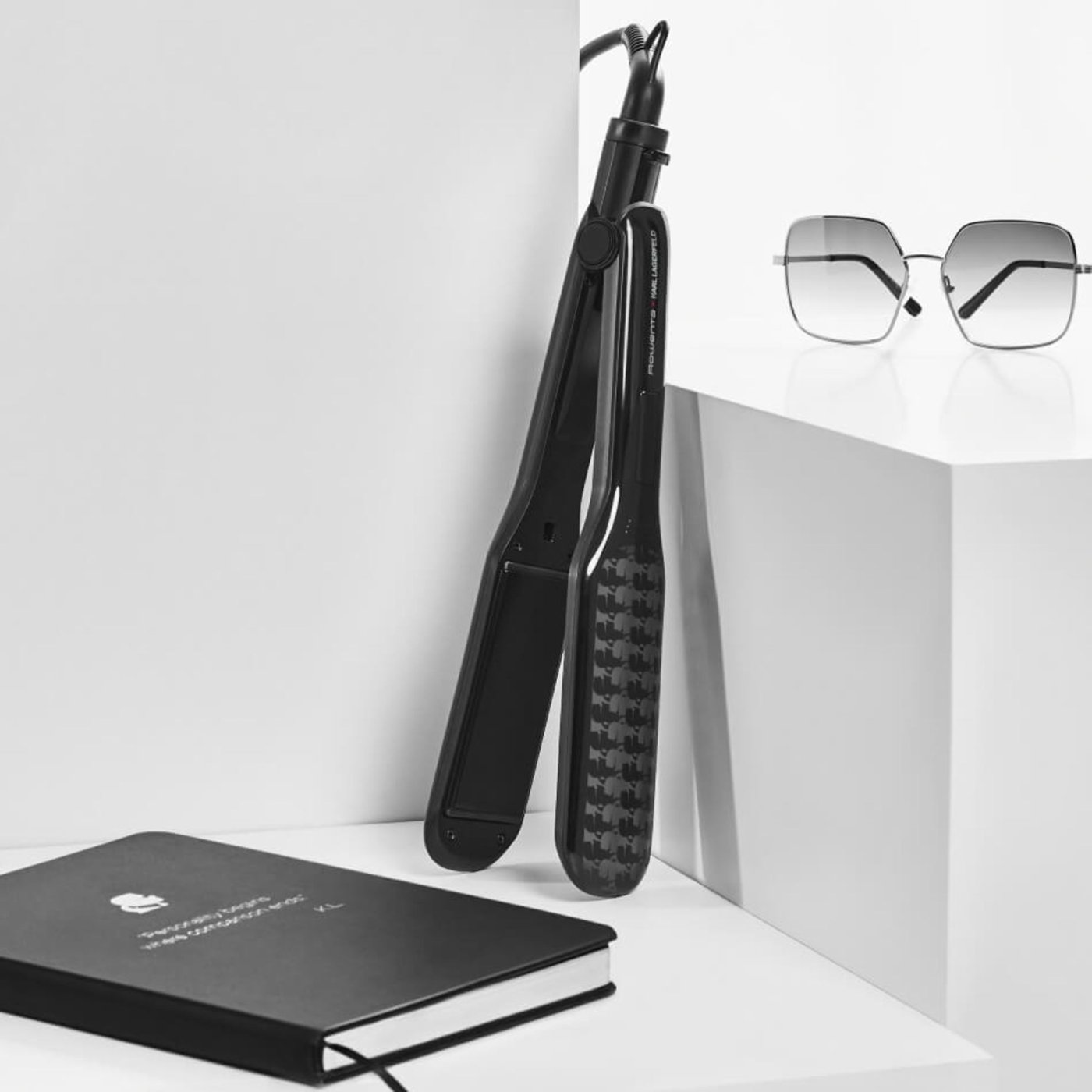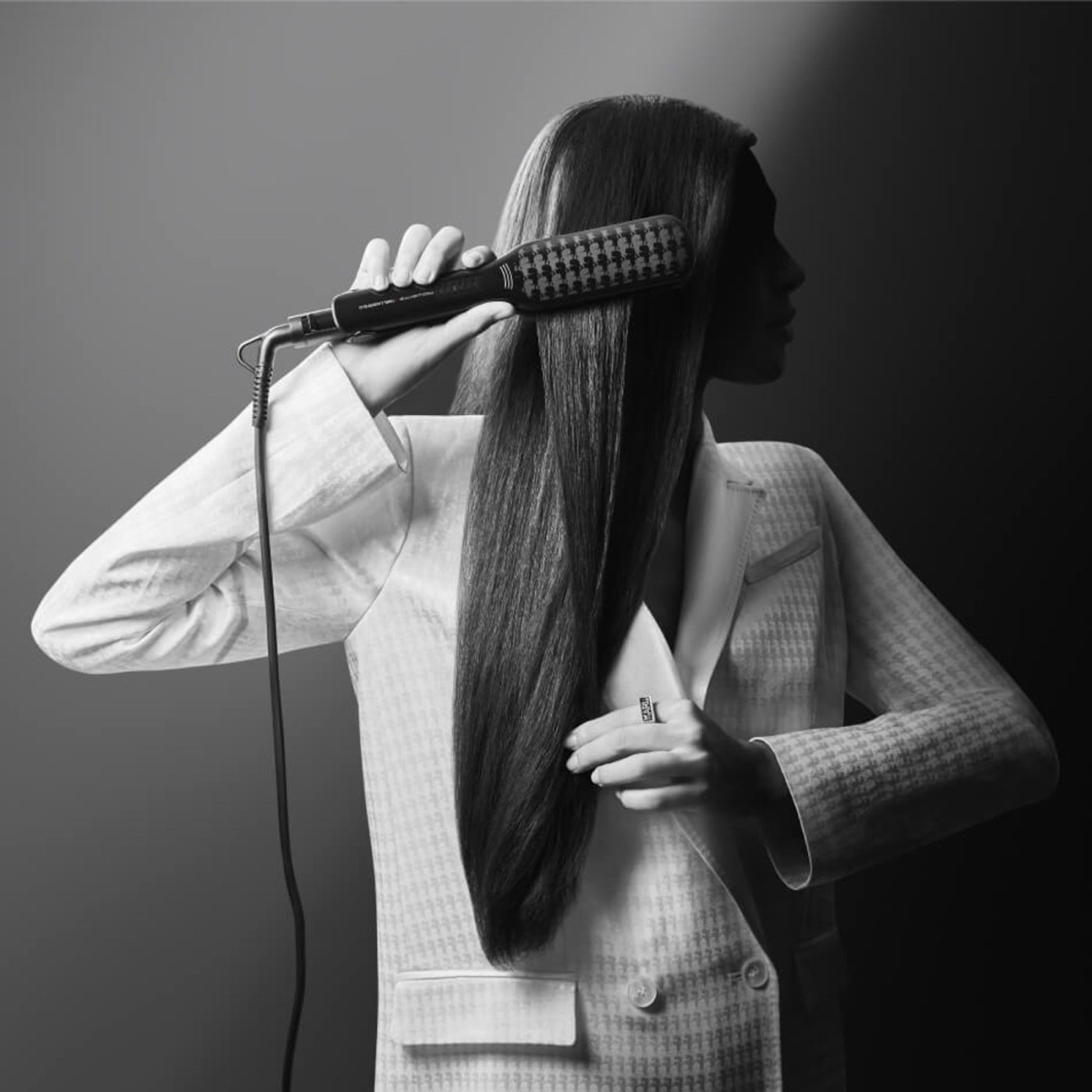 Пресата за коса Rowenta x Karl Lagerfeld Extra Liss предлага професионални резултати за много кратко време, идеална за гъста, дълга или трудна за стилизиране коса. Благодарение на големите и плаващи плочи, устройството автоматично се адаптира към дебелината на кичура, осигурявайки ефективно, равномерно и деликатно изправяне с едно движение.
