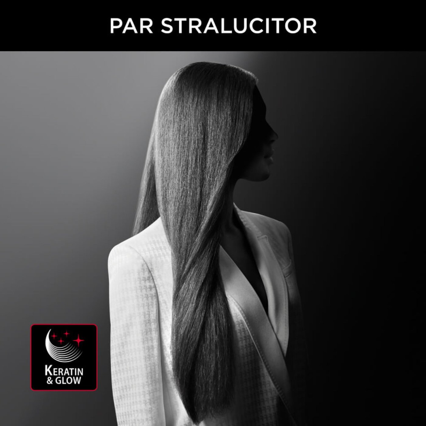 Ексклузивната технология Keratin & Glow комбинира про-кератин, от съществено значение за структурата на косата, с турмалин с естествения му йонен ефект, намалявайки къдренето и осигурявайки интензивен блясък и гладък вид. Резултатът е видимо по-здрава, копринена и лесна за стилизиране коса.