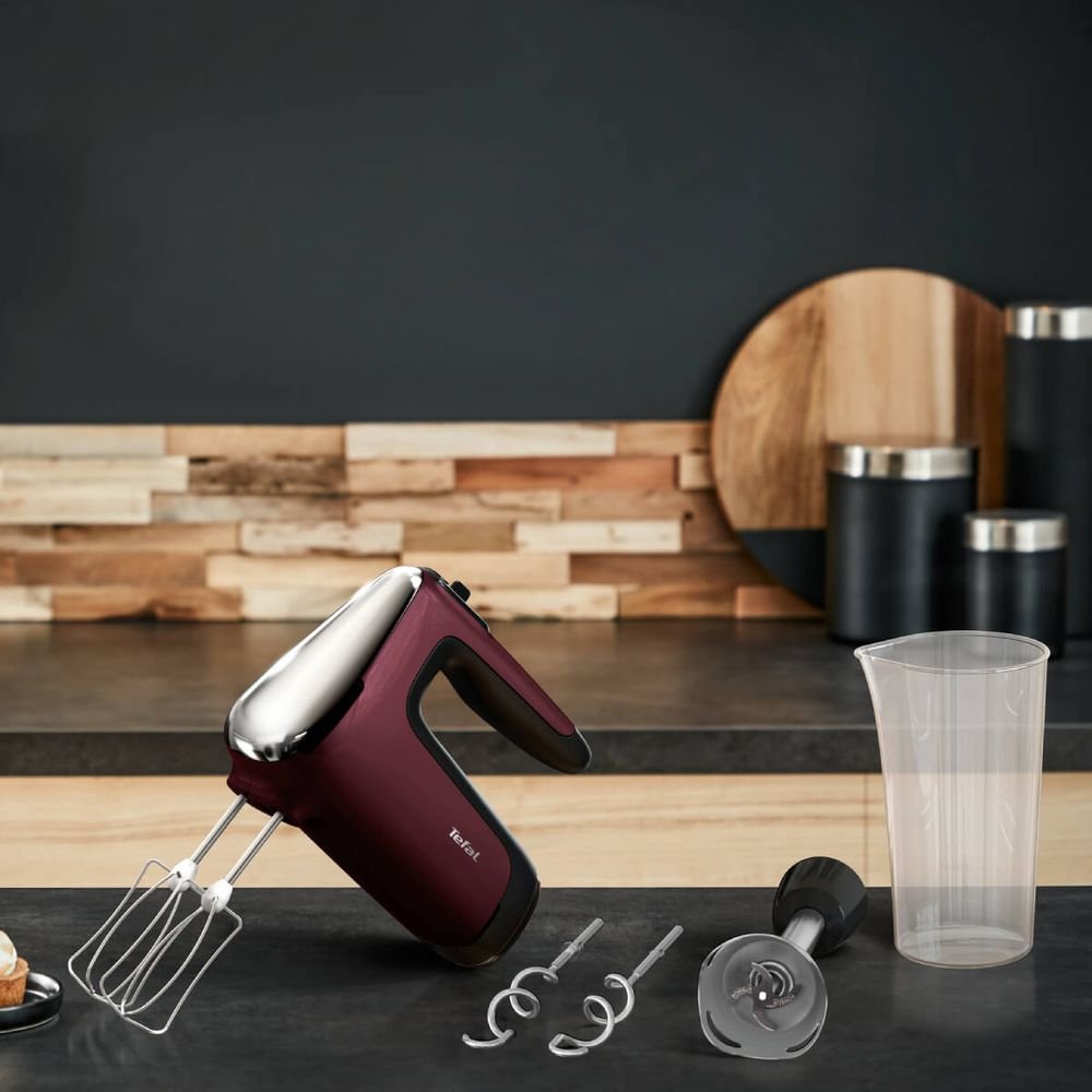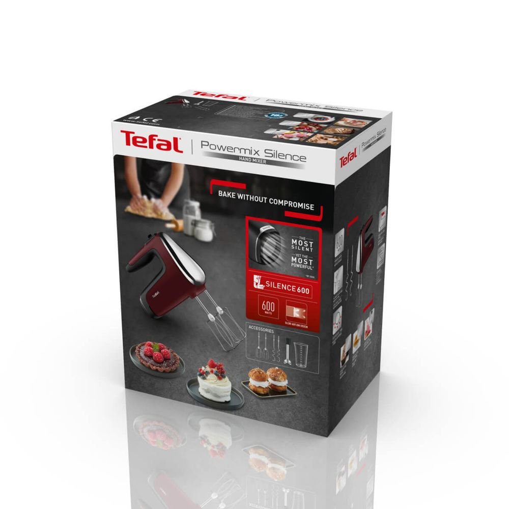 Ръчен миксер Tefal PowerMix Silence HT652538, 600 W, 6 скорости + турбо, технология Silence600, краче за бъркалка, червен
