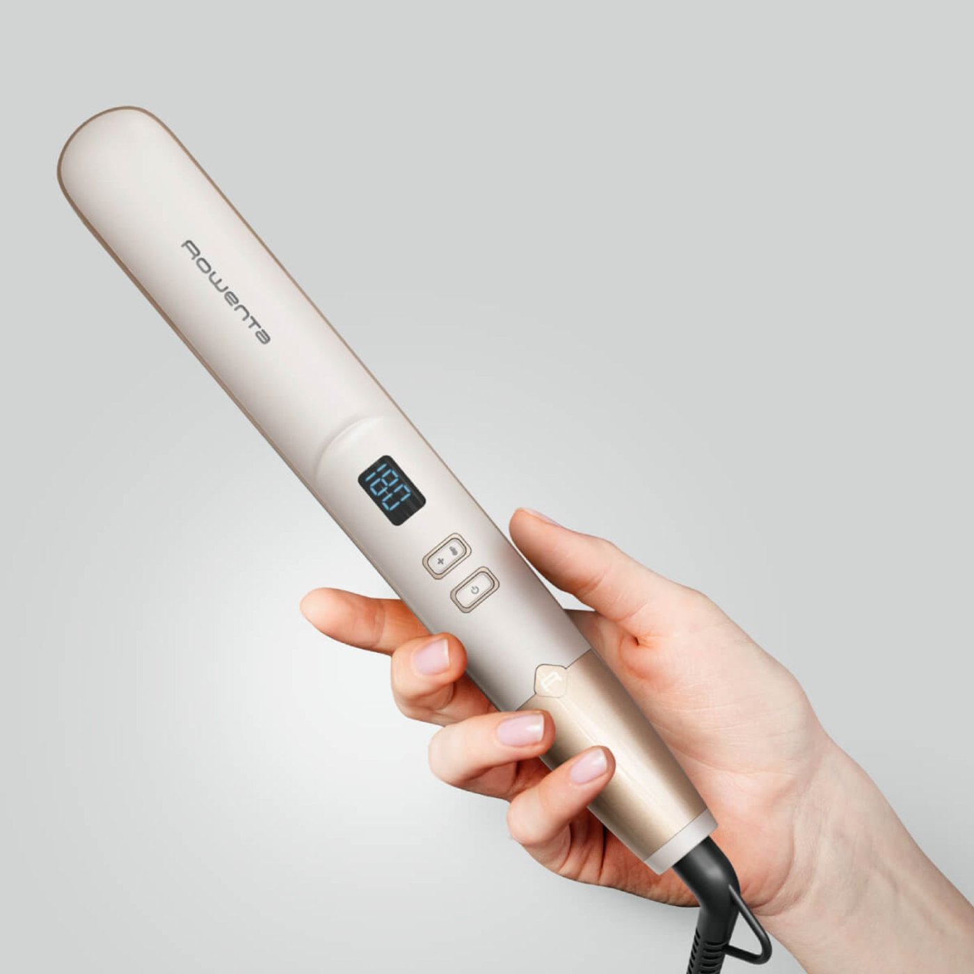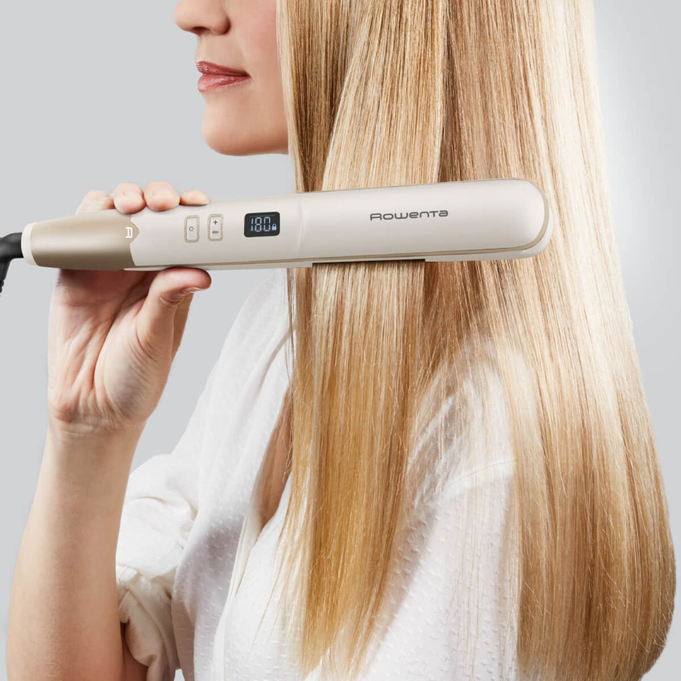 Открийте пресата за коса Rowenta Express Shine SF4633F0, идеалният инструмент за гладка, блестяща и лесна за оформяне коса у дома. Тази професионална преса за изправяне предлага 8 регулируеми температурни настройки, от 140 °C до 230 °C, за да се адаптира към всички типове коса и нужди от стилизиране - от деликатна грижа до интензивно оформяне.