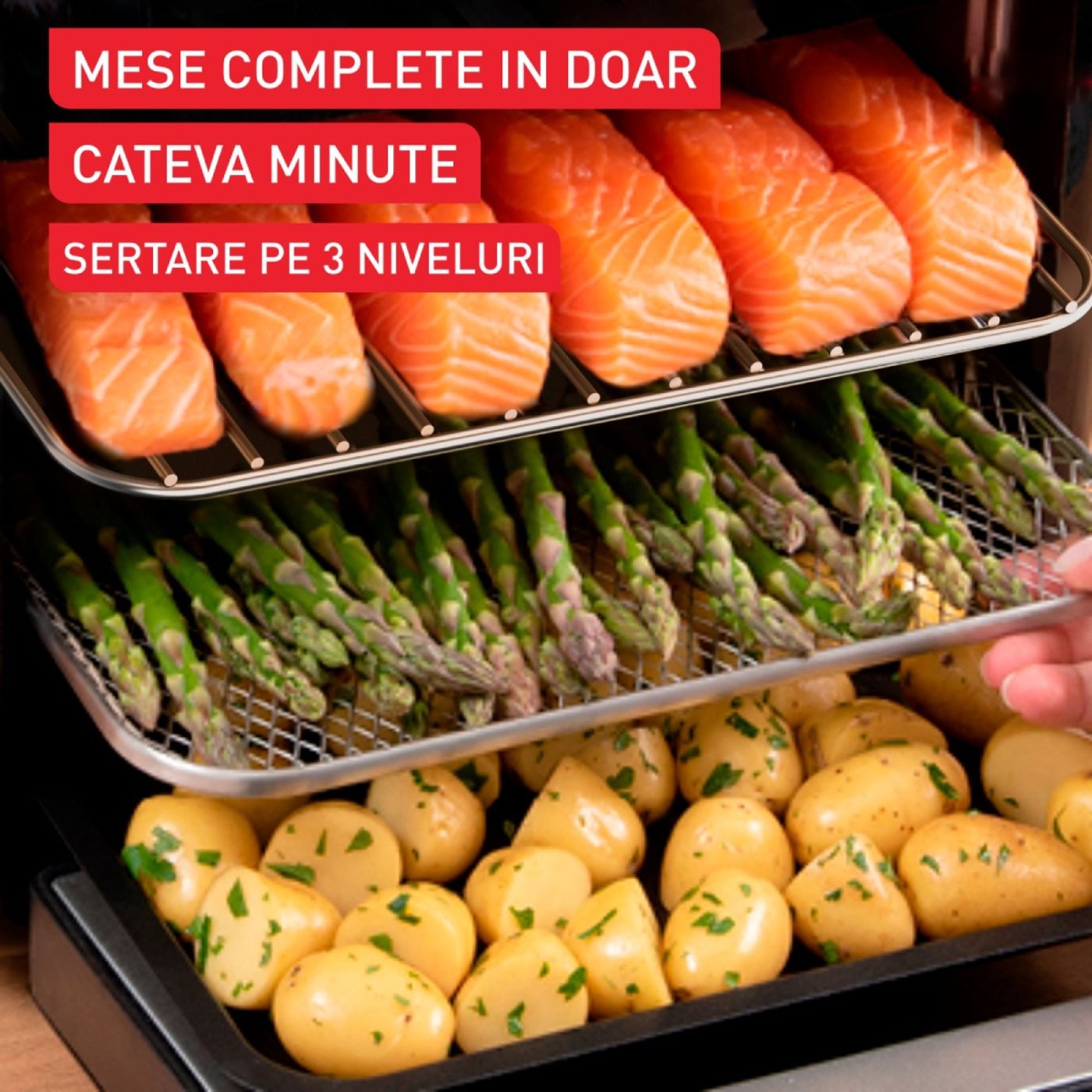 Фритюрникът с горещ въздух Tefal Easy Fry позволява едновременно готвене на няколко нива, благодарение на своите 3 рафта, спестявайки време и опростявайки приготвянето на сложни ястия. Освен това е проектиран за енергийна ефективност, консумирайки до 70% по-малко електроенергия и готвейки до 45% по-бързо в сравнение с традиционна фурна.