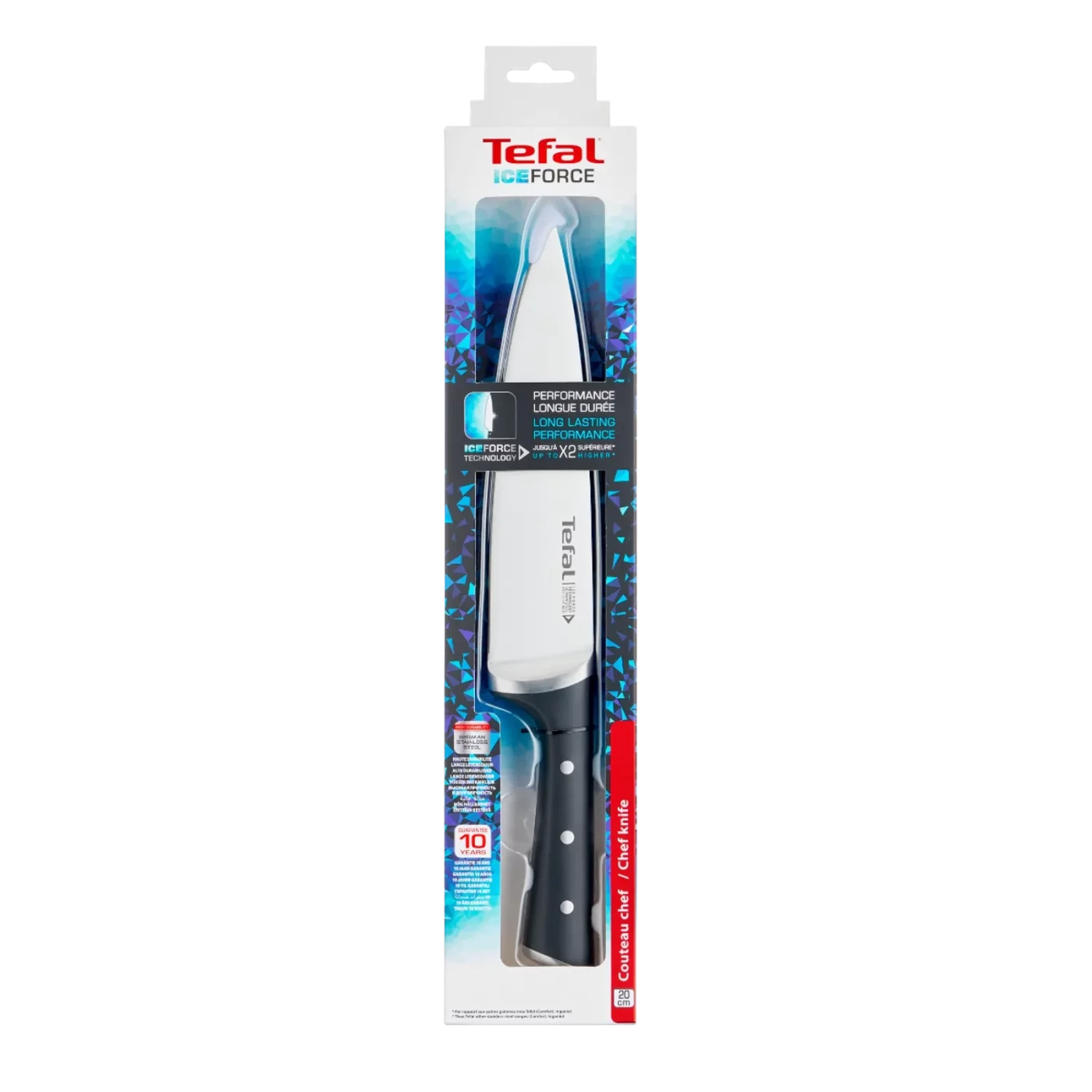 Ножът за готвач Tefal Ice Force K2320214 с дължина 20 см е основният инструмент за бързо нарязване на големи продукти. Той е с технологията Ice Force, при която острието се охлажда до -70 градуса по Целзий за повишена здравина и перфектен завършек. Изработен от немска неръждаема стомана, той предлага до 2 пъти по-голяма издръжливост от другите серии Tefal и включва предпазител за безопасност на ръцете.