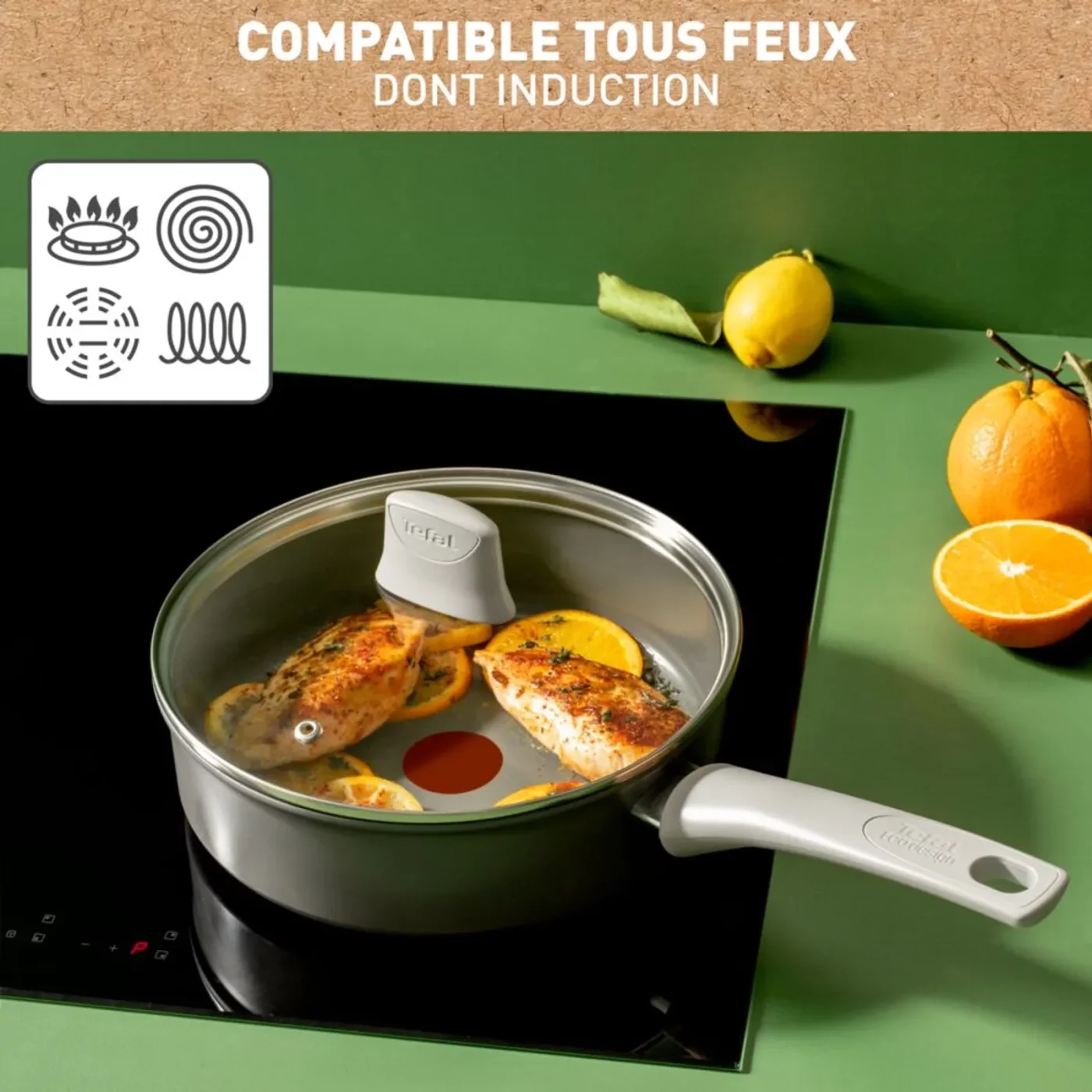 Открийте екологичния тиган Tefal Renew ON 24 см. Изработен от 100% рециклиран алуминий, с незалепващо керамично покритие Inoceram и индикатор Thermo-Signal™, той осигурява здравословно и равномерно готвене. Включва стъклен капак и е съвместим с индукция. Устойчива производителност, произведена във Франция!