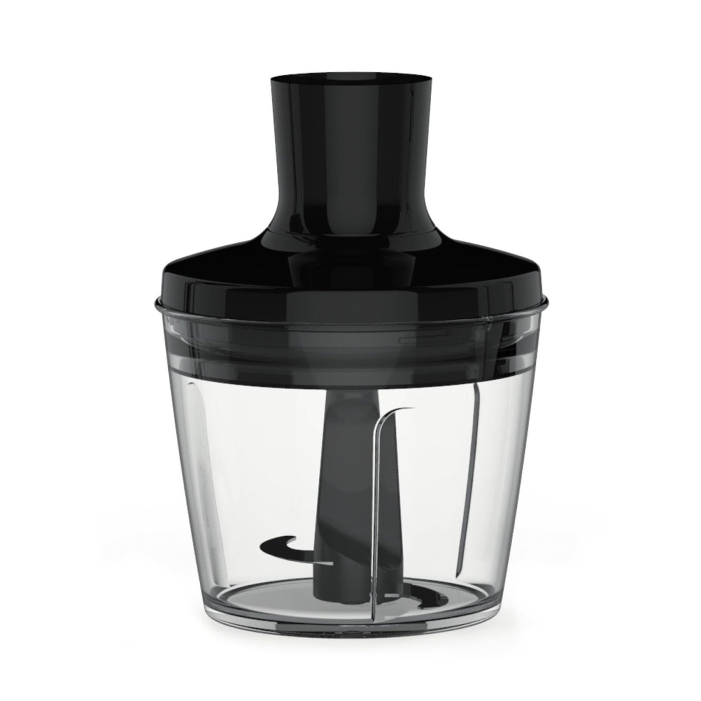 За безопасност и лекота на използване, блендерът е снабден с ергономична неплъзгаща се дръжка, която осигурява стабилност дори при употреба с мокри ръце. В допълнение, пакетът включва мерителна чаша от 800 мл и чопър от 500 мл, идеален за бързо нарязване на зеленчуци, плодове, ядки или подправки.