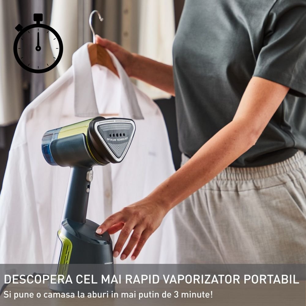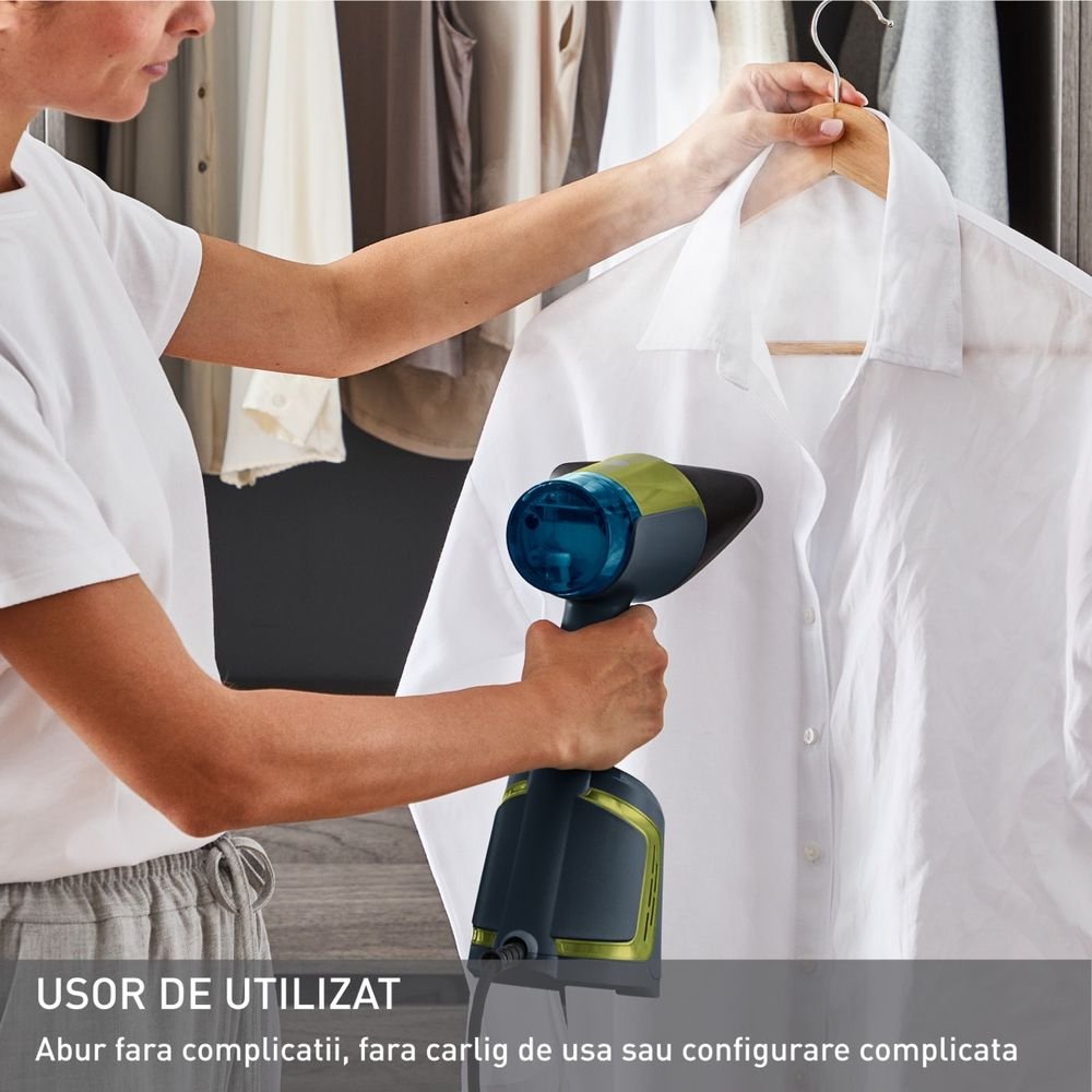 Компактният му дизайн и първокласната изработка Made in France гарантират качество и издръжливост. Дългият 2.6 метра кабел осигурява свобода на движение, а подвижният резервоар от 100 ml осигурява автономност от 6 минути – достатъчно за пълното изглаждане на риза за по-малко от 3 минути.