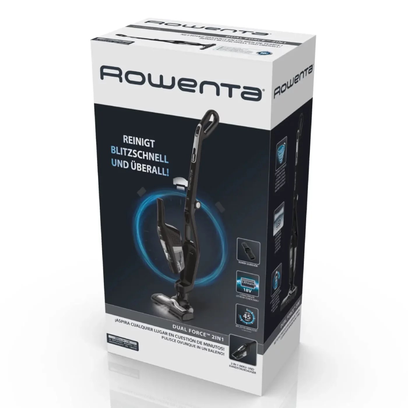 Rowenta 2-в-1 Dual Force RH6735WH вертикална прахосмукачка, 45 мин. време на работа, сгъваема дръжка, LED, контейнер 0.6 л, черна