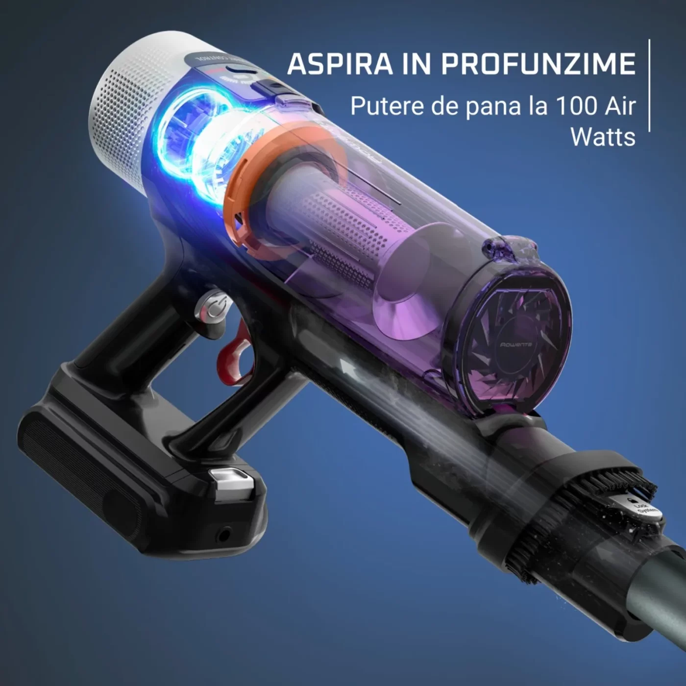 Изпитайте дълбоко и безпроблемно почистване с безжичната вертикална прахосмукачка Rowenta X-Force Flex 9.60 Allergy RH2048WO . Този ултралек модел, тежащ само 1,1 кг в ръчен режим, предефинира комфорта на употреба без компромис с мощността. Оборудвана с 250W мотор, който генерира постоянна всмукателна мощност до 100 Air Watts , тя ефективно премахва прах и мръсотия от всякаква повърхност. Интелигентната технология за разпознаване на типа под автоматично регулира всмукателната мощност, осигурявайки ви перфектния баланс между производителност и оптимална консумация на батерия, осигурявайки автономност до 45 минути .