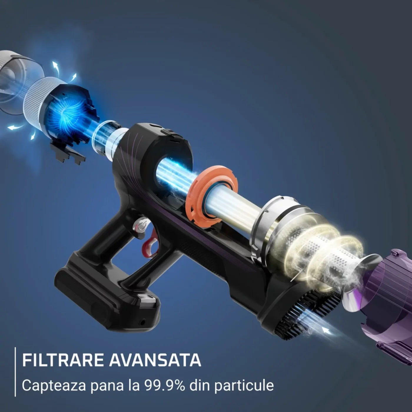 Основната иновация, гъвкавата тръба с технология Flex , ви позволява да почиствате под ниски мебели до 4 пъти по-ефективно от класическа прахосмукачка, елиминирайки необходимостта от навеждане. Вариантът Allergy е специално проектиран за здравословна среда, с високоефективна филтрираща система, която задържа 99,9% от фините частици, алергени и прах. Контролът е на една ръка разстояние чрез екрана Smart Display, който показва нивото на батерията в реално време и 3-те нива на мощност, включително функцията Boost за труднодостъпни зони. Основната четка с LED осветление изважда скрития прах наяве, гарантирайки безупречен дом с едно движение.