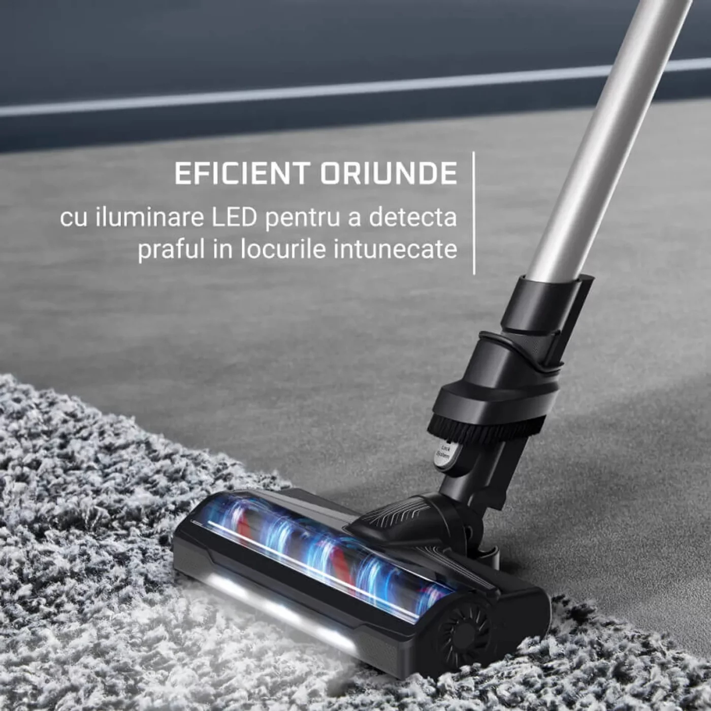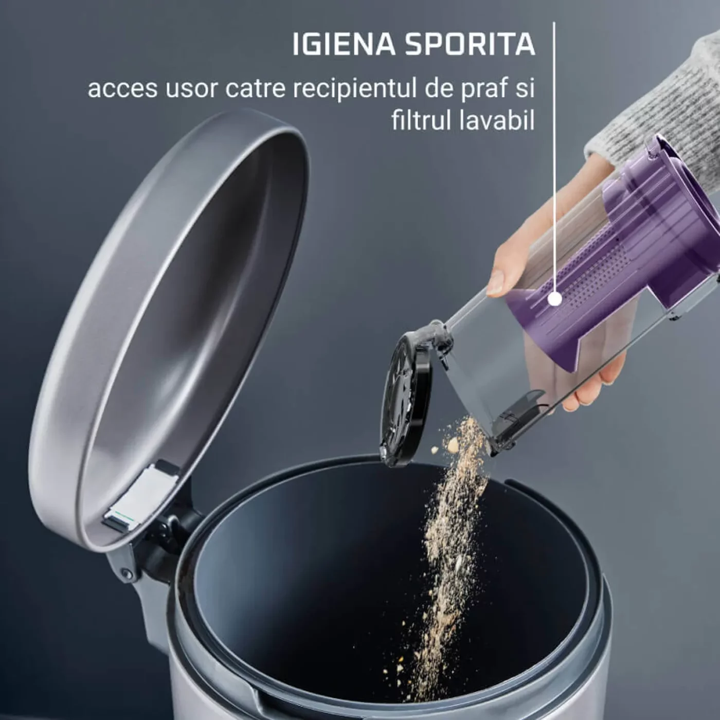 Високоефективната филтрираща система задържа до 99% от праха, алергените и фините частици, оставяйки след себе си по-чист и по-здравословен въздух. Моторизираната четка е оборудвана с вградено LED осветление, което изважда наяве праха, скрит под мебелите или в тъмните ъгли. Контейнерът за прах с обем 0,44 л е проектиран за хигиенично и бързо изпразване и е напълно миещ се за лесна поддръжка. Универсалността се осигурява от моменталното превръщане в ръчна прахосмукачка, което ви позволява да почиствате дивани, автомобилни седалки или високи помещения без никакви затруднения. С елегантен дизайн в лилаво и черно, Rowenta X-Pert 7.60 е модерният и надежден партньор за винаги подреден дом.