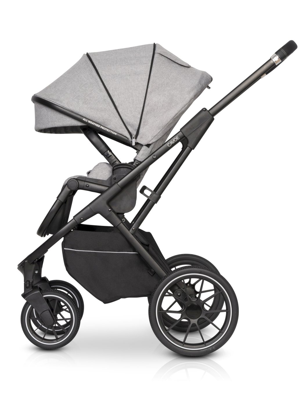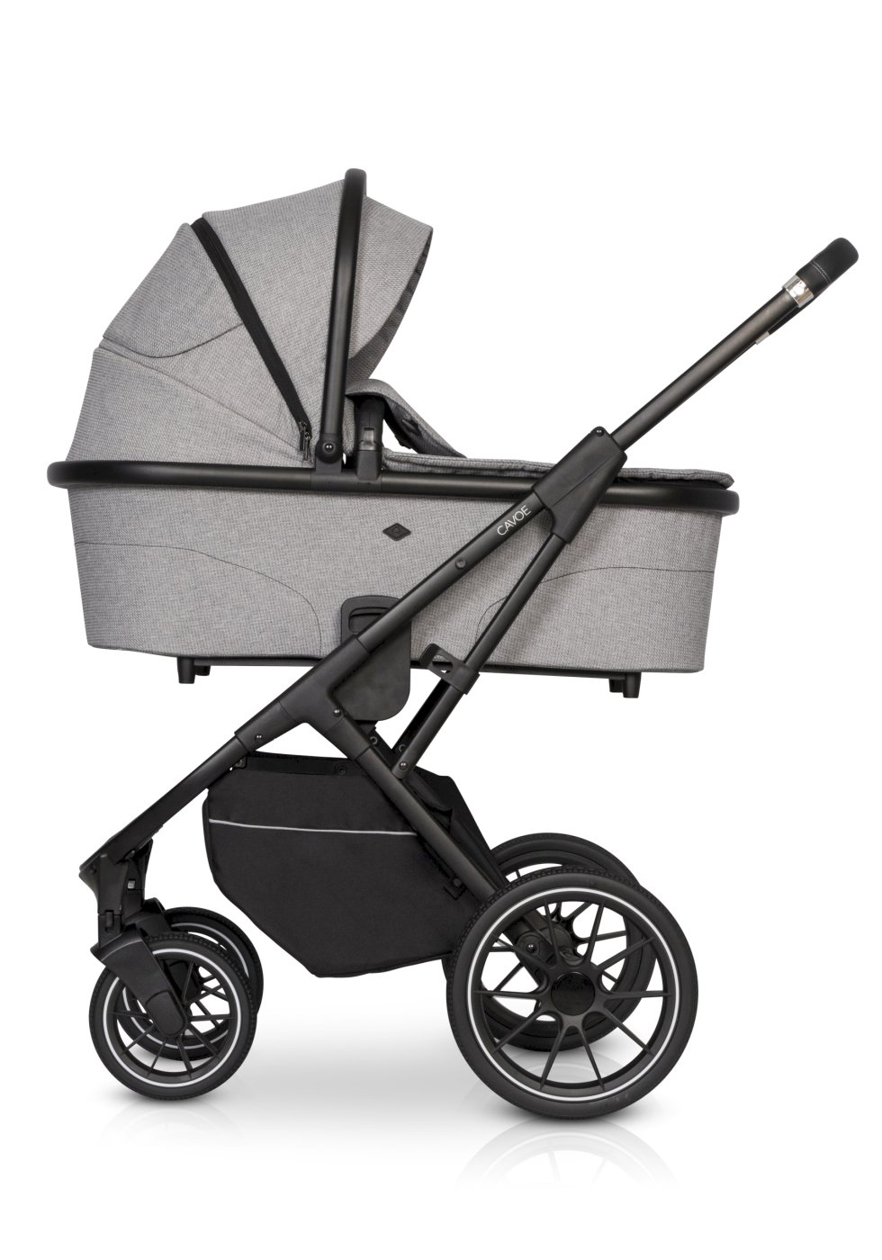 Бебешката количка CAVOE AXO Comfort предлага отлично абсорбиране на удари благодарение на големите си гумени колела, идеални за всякакъв вид терен, достатъчно големи, за да се справят дори със сняг.