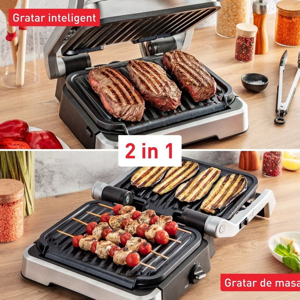 Електрическата скара Tefal OptiGrill 2 в 1 GC773D30 е интелигентна и многофункционална скара, предназначена да превърне домашното готвене в лесно и вкусно изживяване. Мощността от 2100 W и 9-те автоматични програми за готвене ви позволяват бързо да приготвяте широка гама от ястия, включително червено месо, пилешко месо, риба, бургери или зеленчуци, като автоматично регулирате времето за готвене в зависимост от дебелината и броя на парчетата за перфектни резултати всеки път. Индикаторът за готвене ви помага да следите напредъка на ястието, без да се налага постоянно да наблюдавате скарата, а подвижните плочи с незалепващо покритие улесняват почистването след всяка употреба. Скарата може да се използва както в затворен режим, за класическо готвене, така и в отворен режим, като настолна скара, предлагайки максимална гъвкавост за различни рецепти.