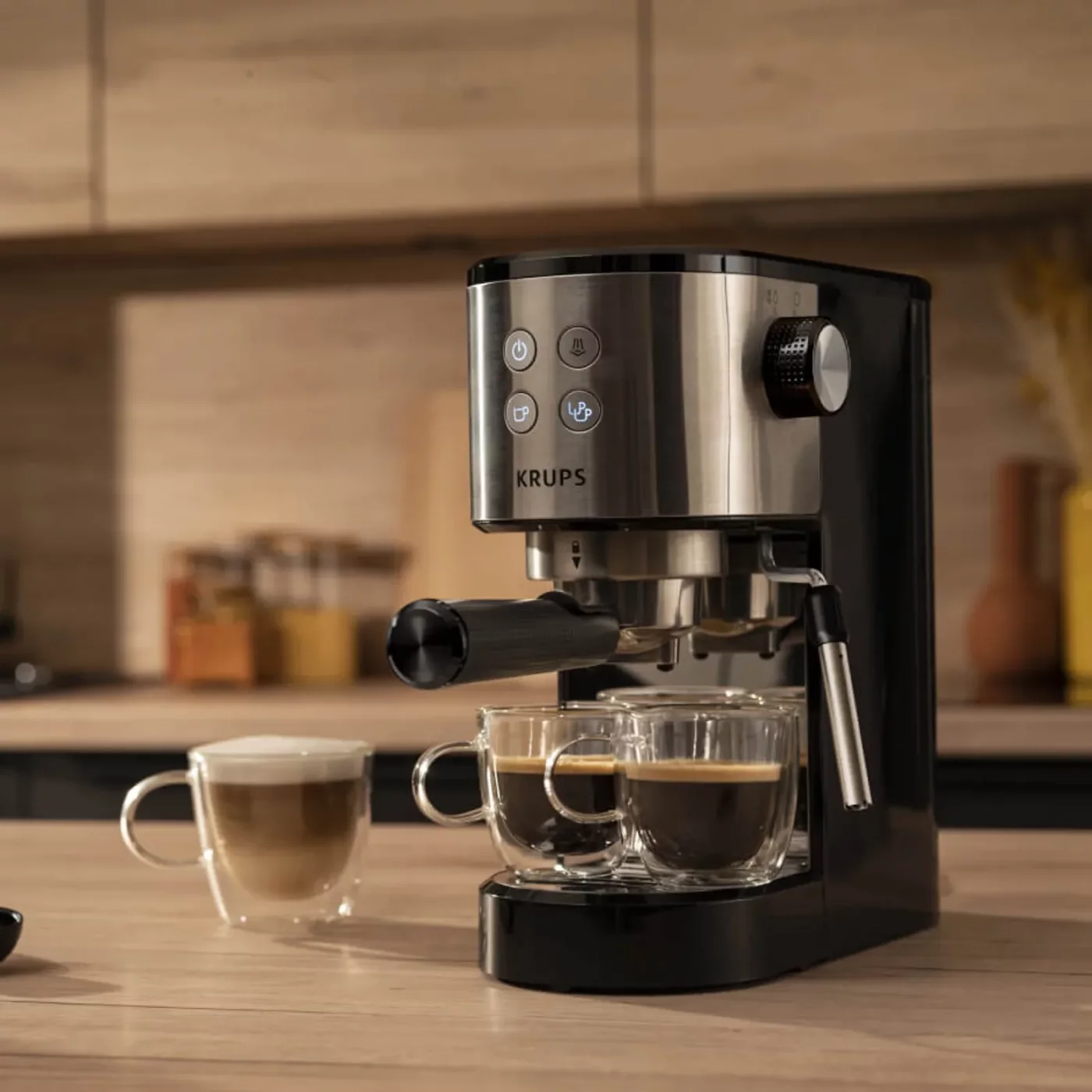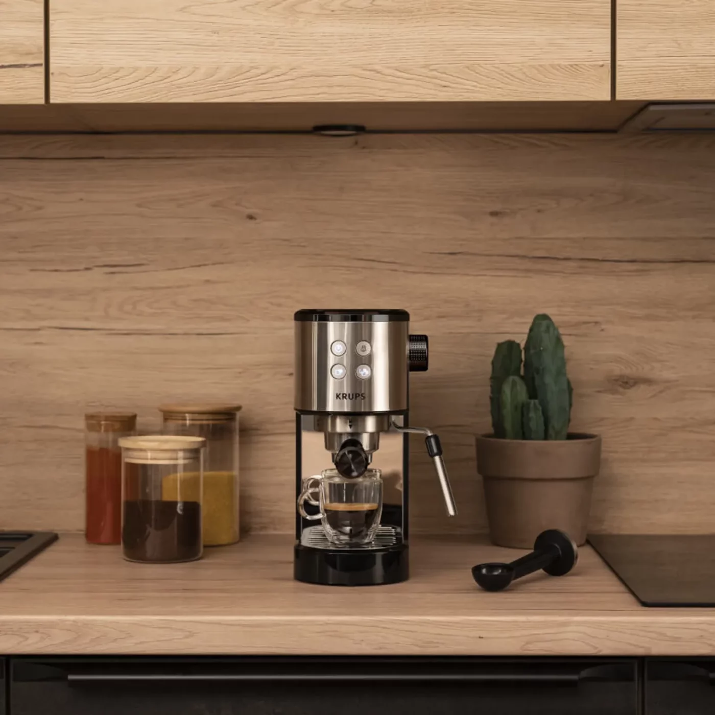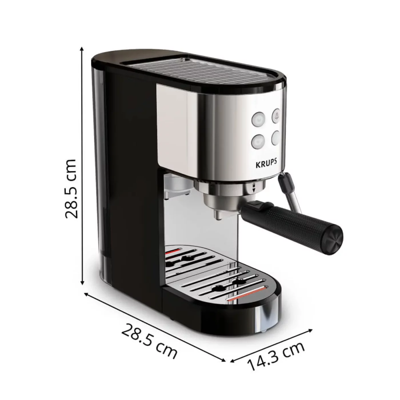 Превърнете дома си в професионално кафене с Krups Virtuoso Essential XP441810. Тази компактна и стилна еспресо машина ви дава всичко необходимо, за да приготвите перфектно еспресо, с пълен контрол над всяка стъпка, от смилането на кафето до разпенването на млякото.