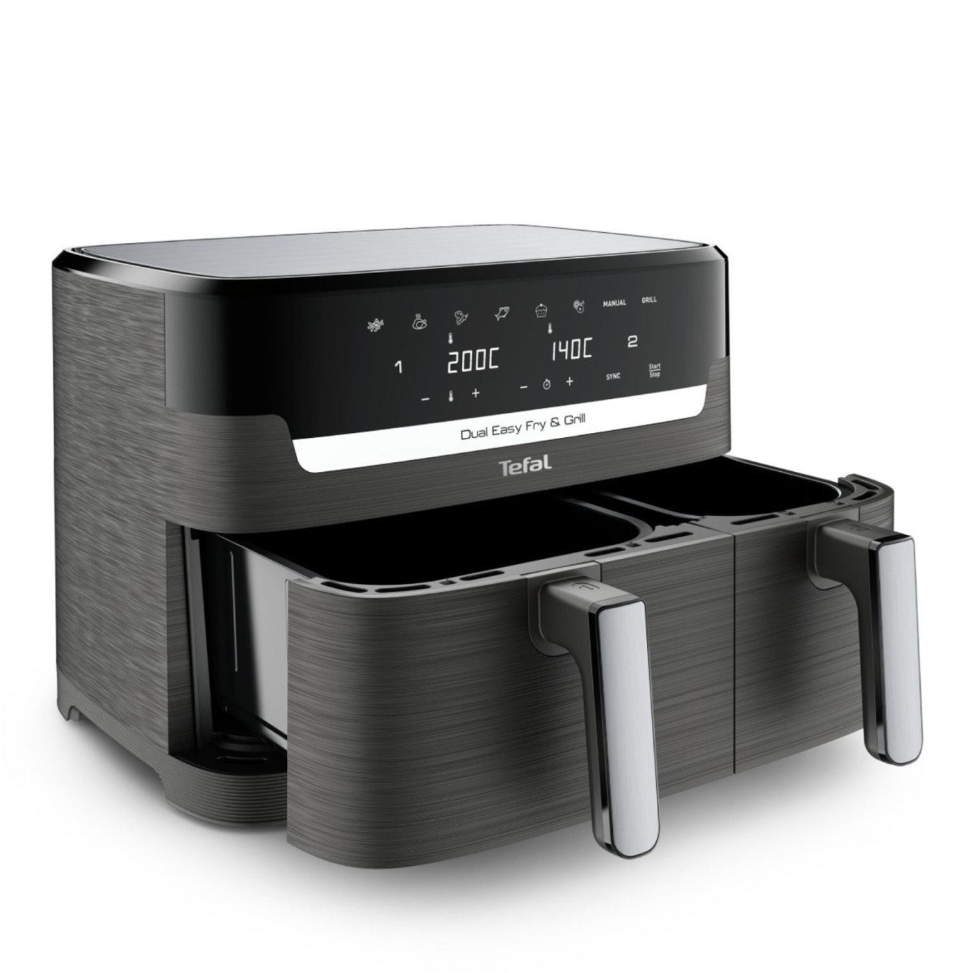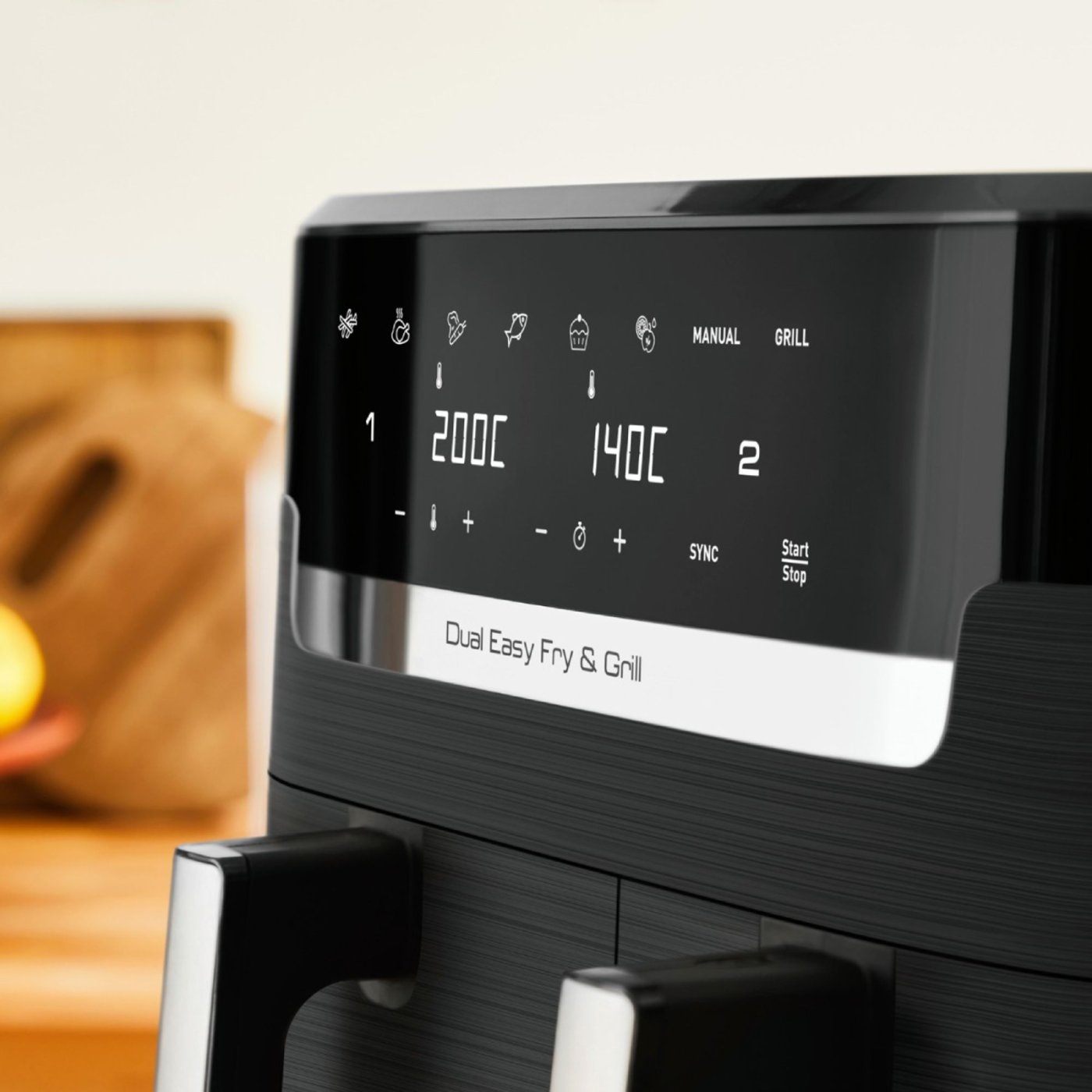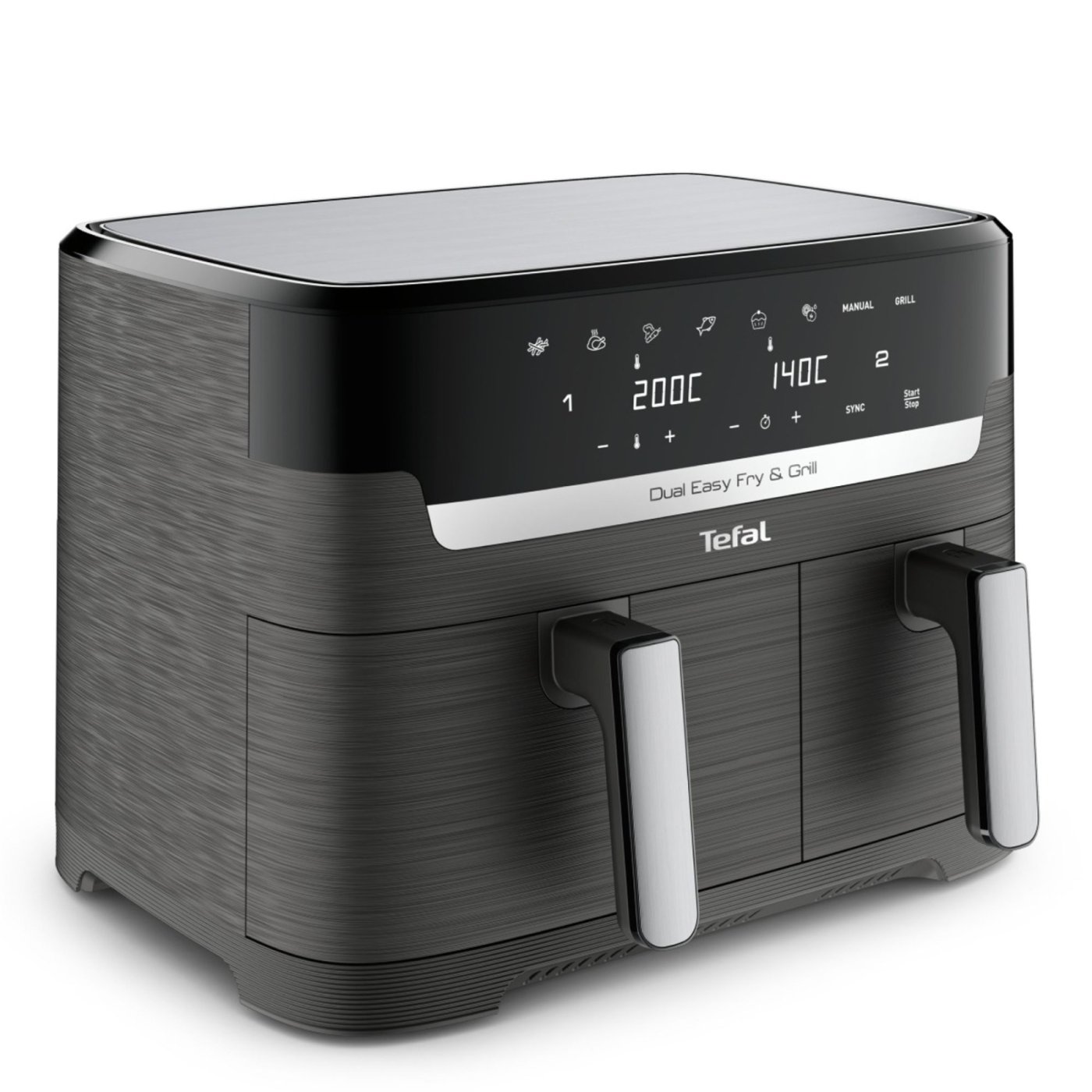 Насладете се на разнообразни и балансирани ястия за цялото семейство с фритюрника Tefal Dual Easy Fry & Grill Air Fryer, многофункционален уред, който съчетава готвене с горещ въздух и печене на грил в едно високопроизводително устройство. Благодарение на двойните чекмеджета можете да готвите едновременно две различни рецепти, спестявайки време и енергия, без да правите компромис с вкуса или текстурата на ястията.