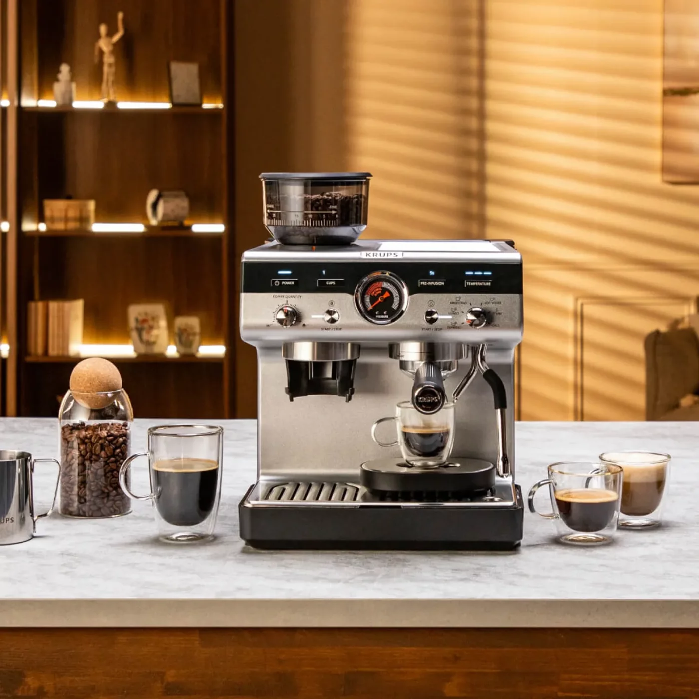 Превърнете всяка чаша кафе в автентично изживяване с Krups Precision. Проектирана за любителите на еспресо и напитки на млечна основа, тази ръчна машина за еспресо с вградена мелачка ви дава пълен контрол над всеки детайл: от смилането и предварителното запарване до екстракцията и разпенването.
